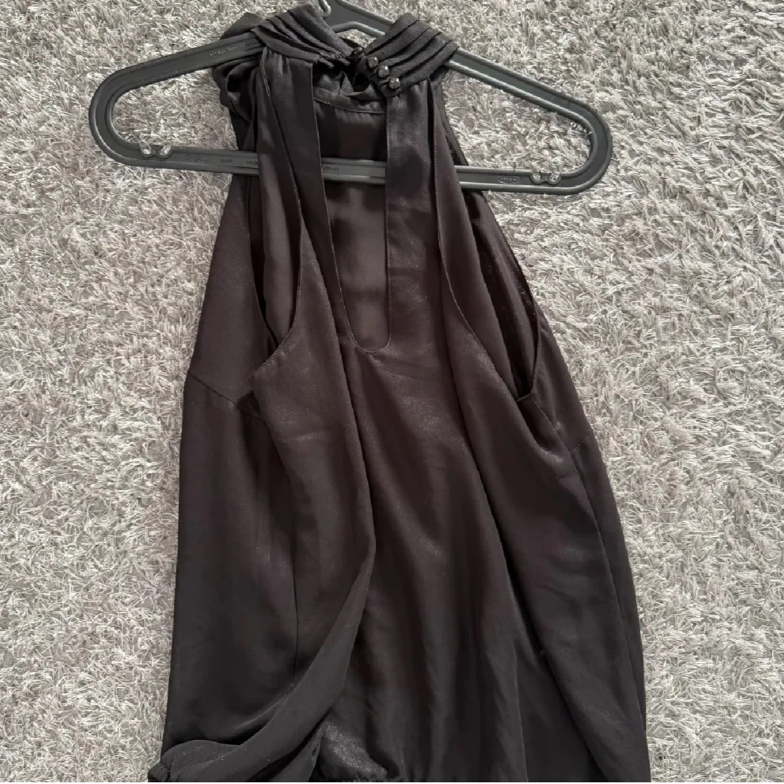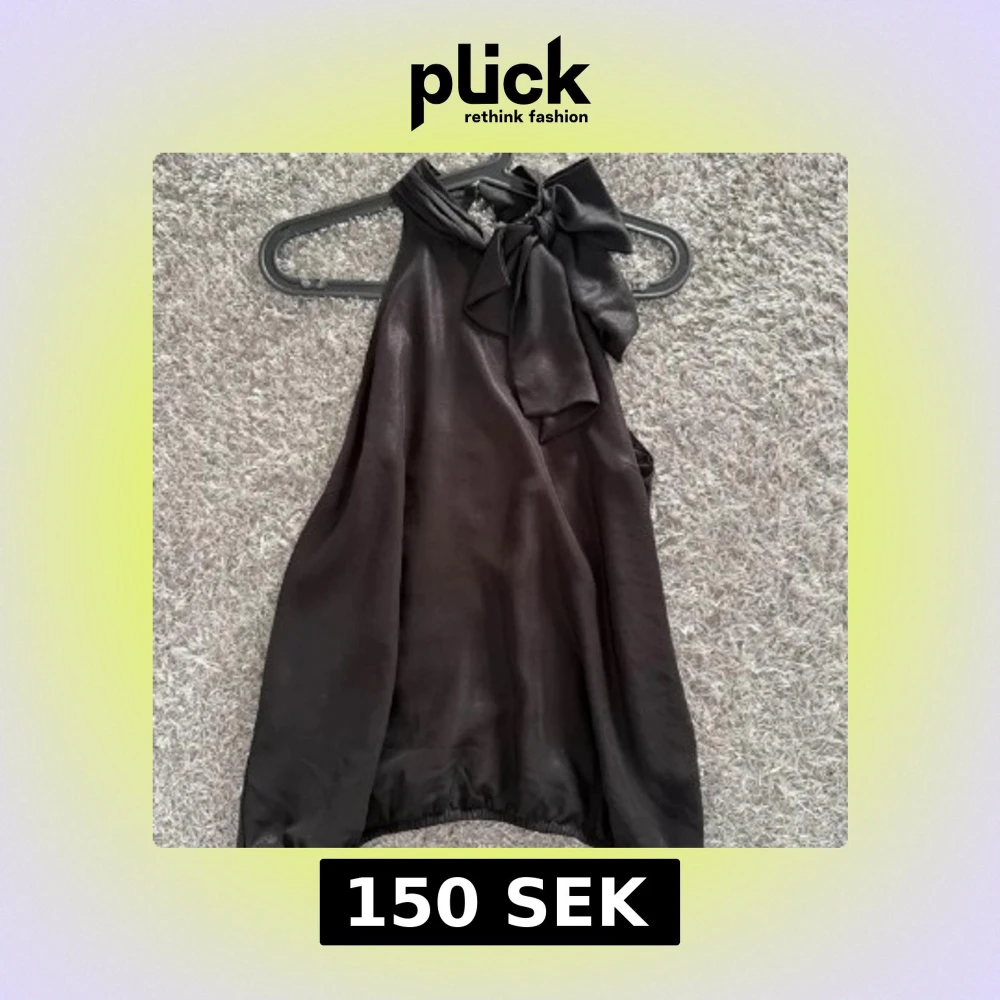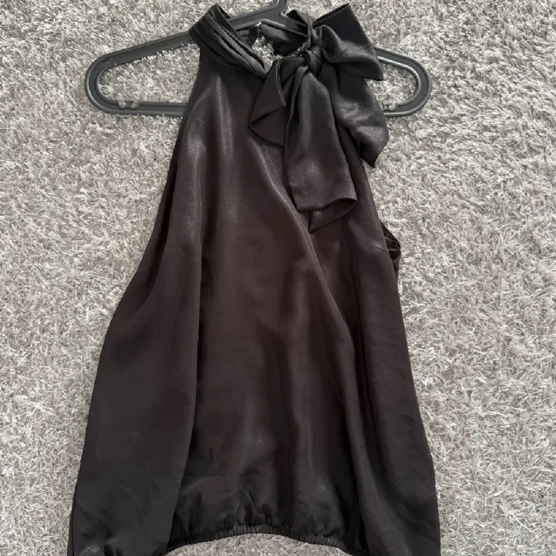 Snygg svart blus i omlottmodell med stor rosett vid halsen. Blusen är ärmlös och har en lätt glansig finish som ger en lyxig känsla. Priset kan diskuteras!!