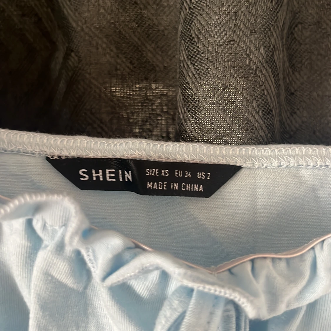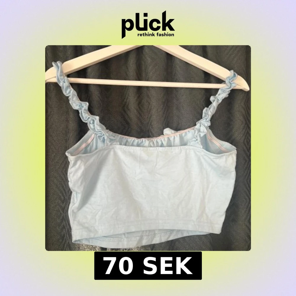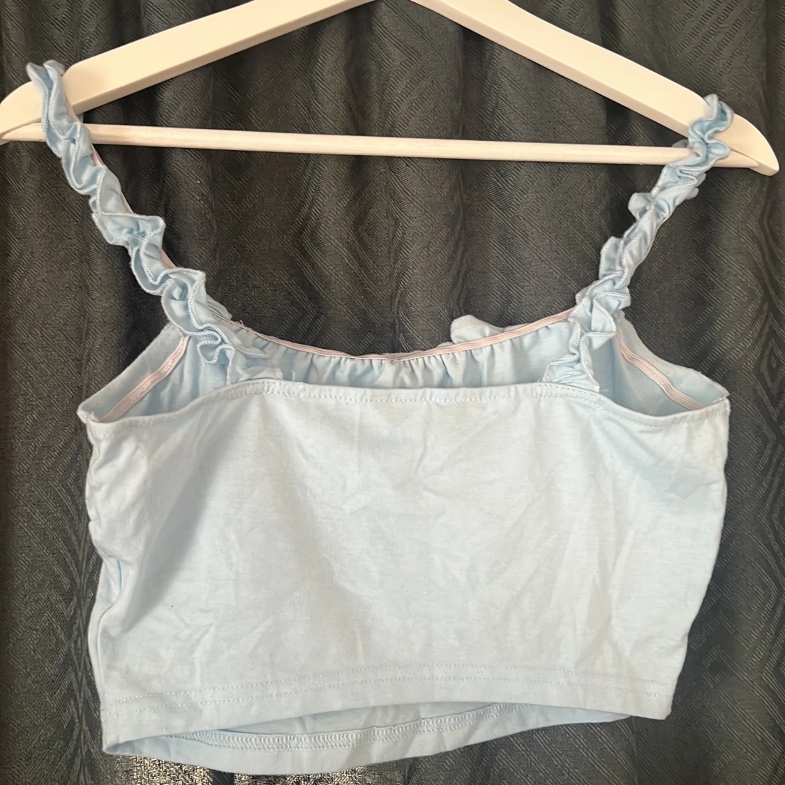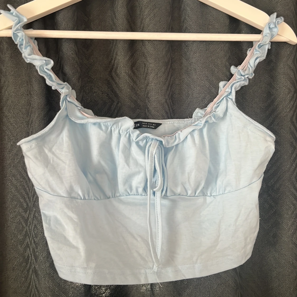 Supersöt ljusblå croppad linnetopp från SHEIN med volangprydda axelband och knytning framtill. Toppen har en enkel, rak passform och är tillverkad i mjuk bomullsmix. Perfekt för varma dagar när du vill ha en söt och chill look.