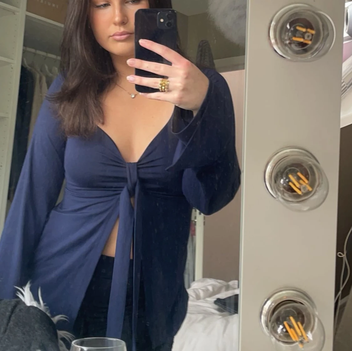 Intressekoll på min designbysi tröja i mörkblå😍 Använda få tal gånger, då den är som ny! Man kan knyta bandet hur man vill, då de inte sitter fast i tröjan!💕 hör av er för fler frågor