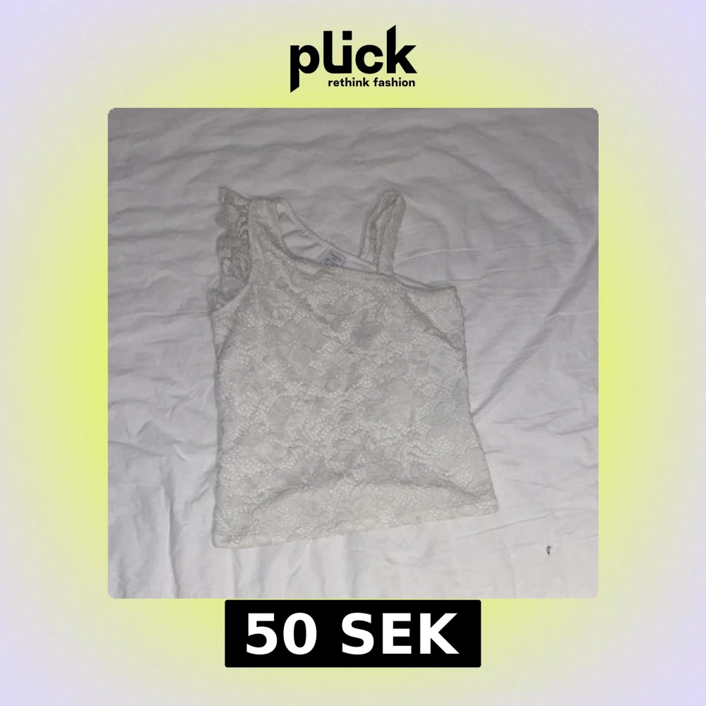Söt vit topp från Lindex med blommig spets och asymmetrisk design. Ena axeln har en smal axelrem och den andra en volangdetalj. Perfekt för sommarens varma dagar eller när du vill ha något extra fint.