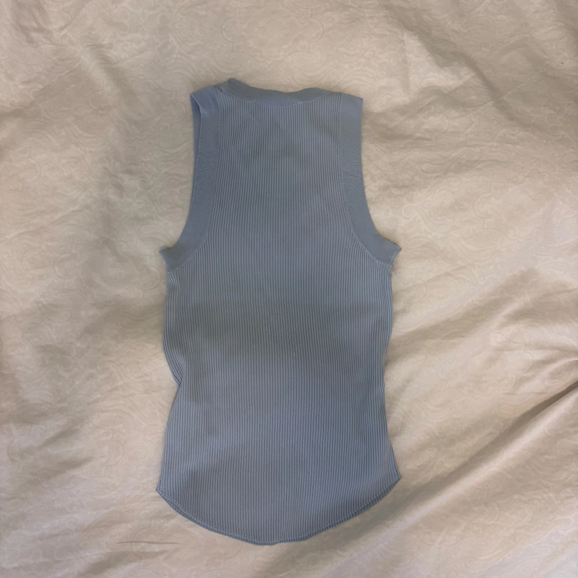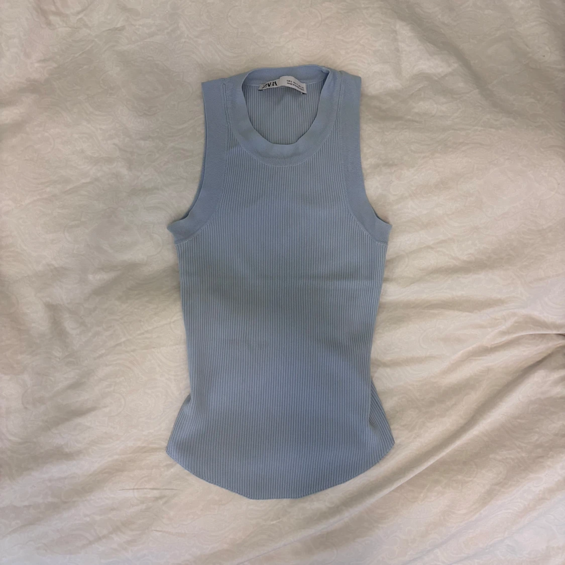 Supersnygg ljusblå ribbad linnetopp från Zara med hög hals och ärmlös design. Storlek S. Toppen har en figurnära passform och en unik, lätt rundad nederkant som ger en modern vibe. Perfekt att styla med jeans eller kjol för en fräsch look. Toppen har nästan aldrig blivit använd och är i mycket bra kvalitet. Säljer då den inte kommit till användning.