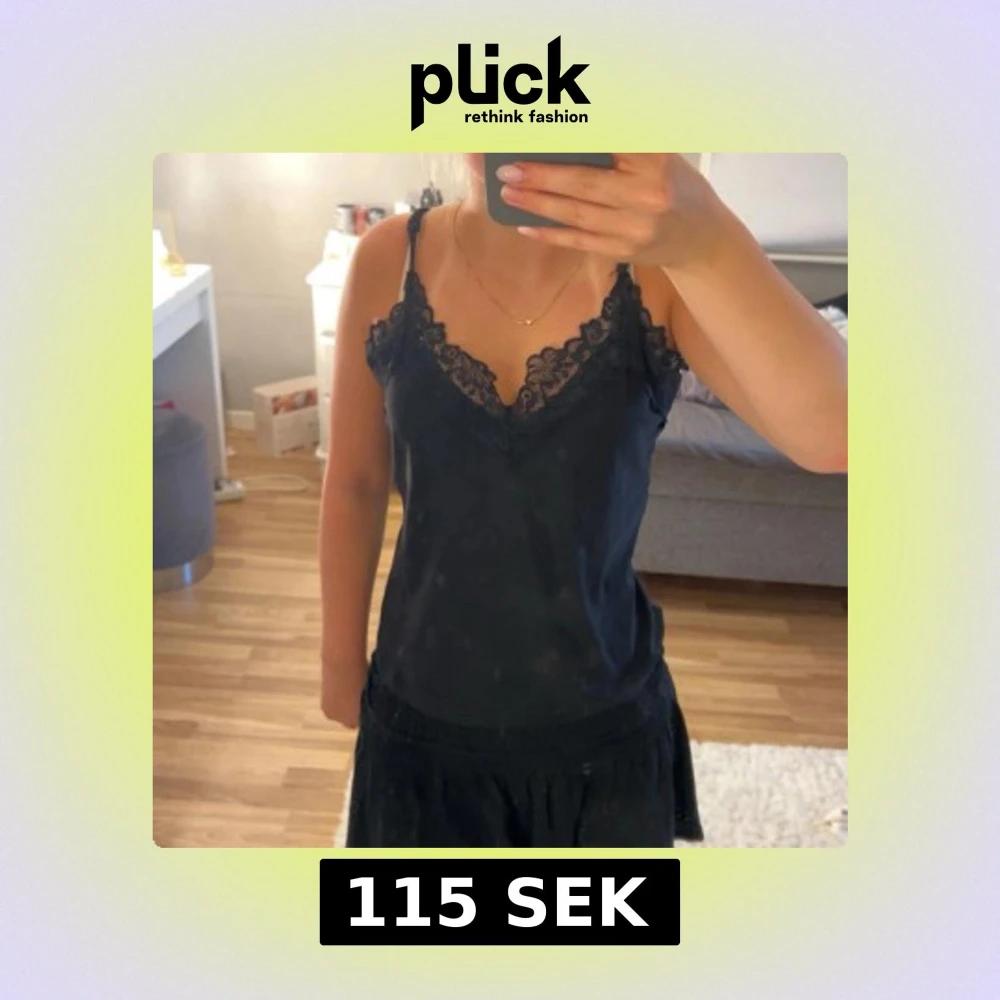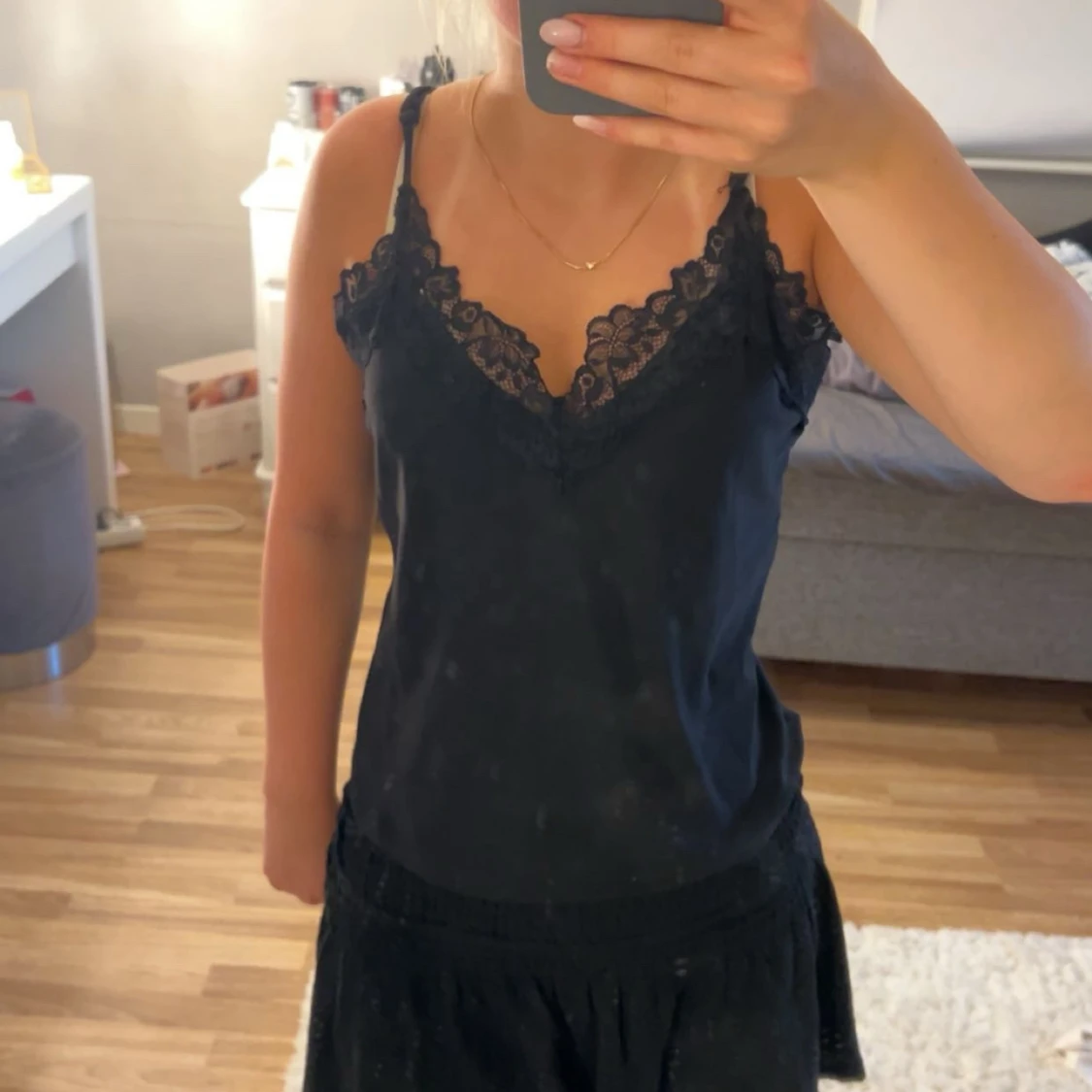 Supersnygg svart linnetopp från Vero Moda med tunna axelband och v-ringning dekorerad med spets.