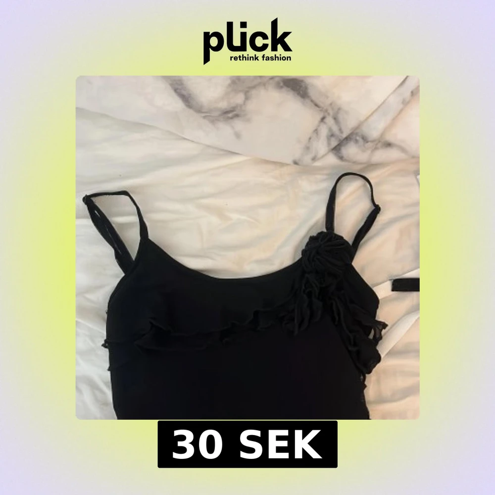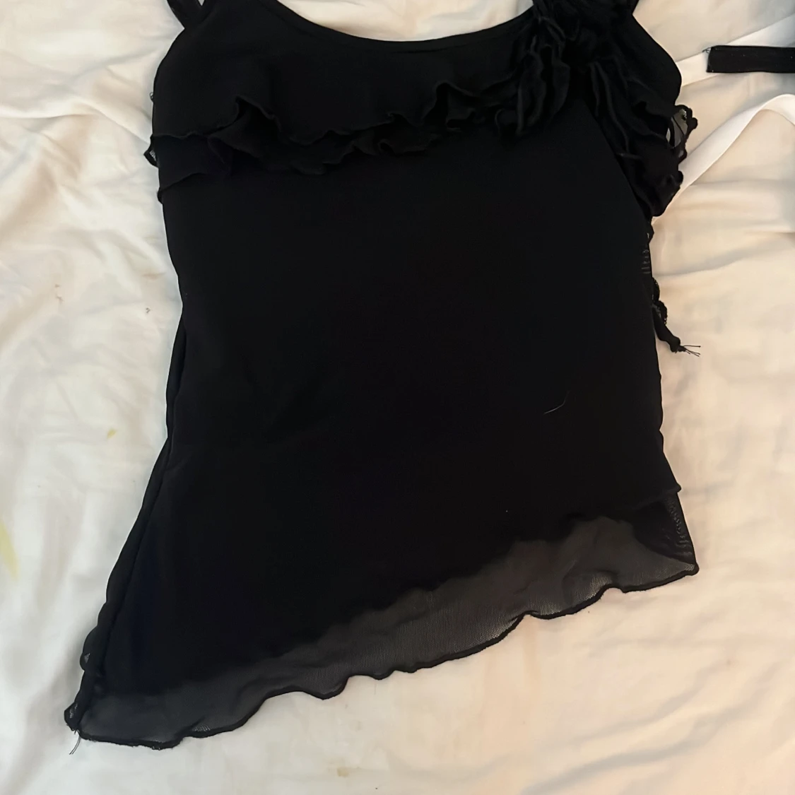 Supersnygg svart linnetopp med tunna axelband, volang längs bröstet och en stor tygblomma på ena axeln. Toppen har asymmetrisk nederkant och är gjord i ett lätt, skirt material som ger en cool och luftig känsla.