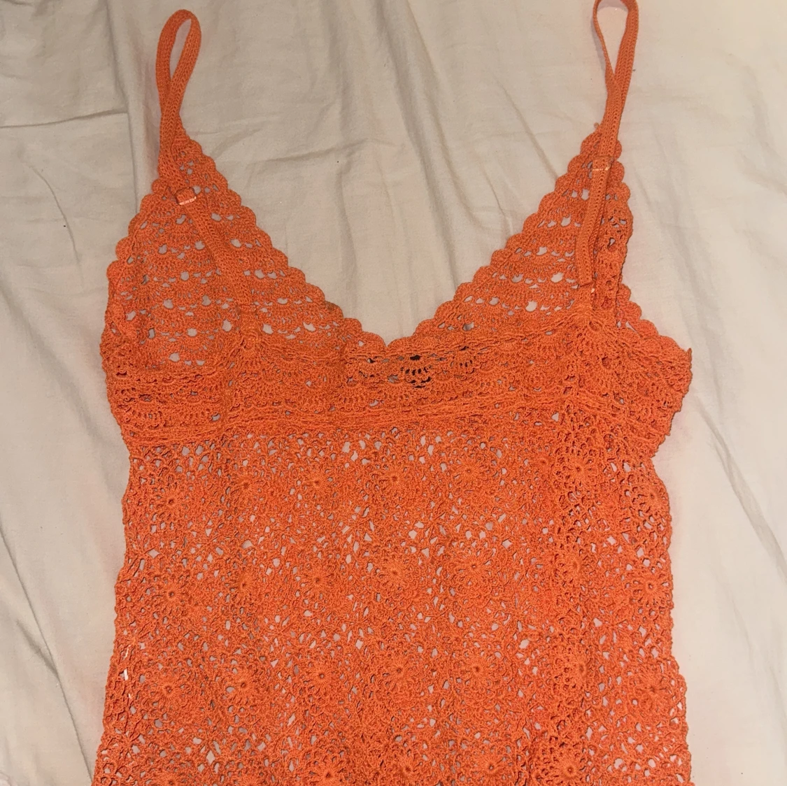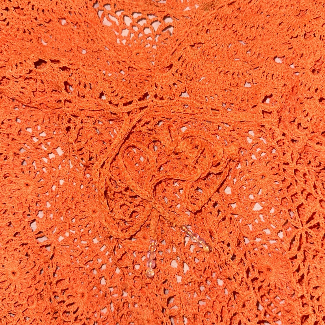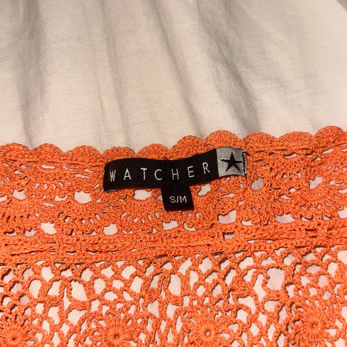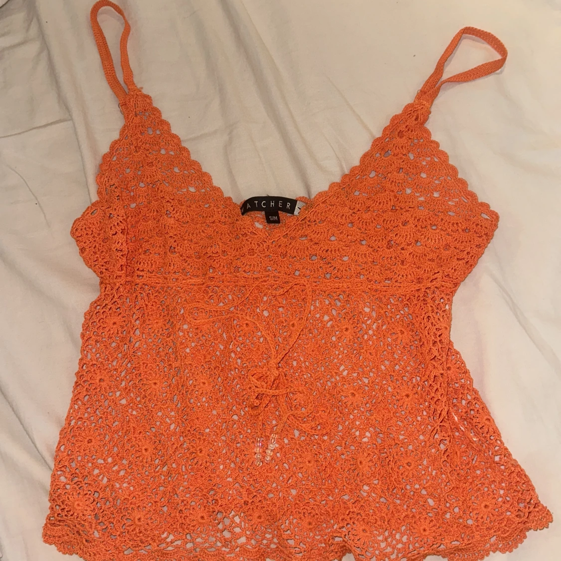 Superfin orange virkad linnetopp från Watcher med smala axelband och v-ringning. Toppen har knyt under byster med en tråd med små pärlor i ändarna(bild3) och ett detaljerat blommönster i virkningen. Perfekt för sommarens alla tillfällen!💕 använd enstaka gång på semester❤️