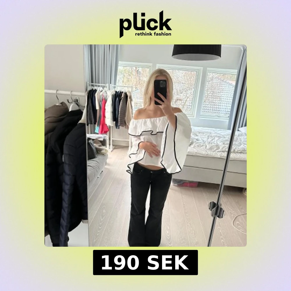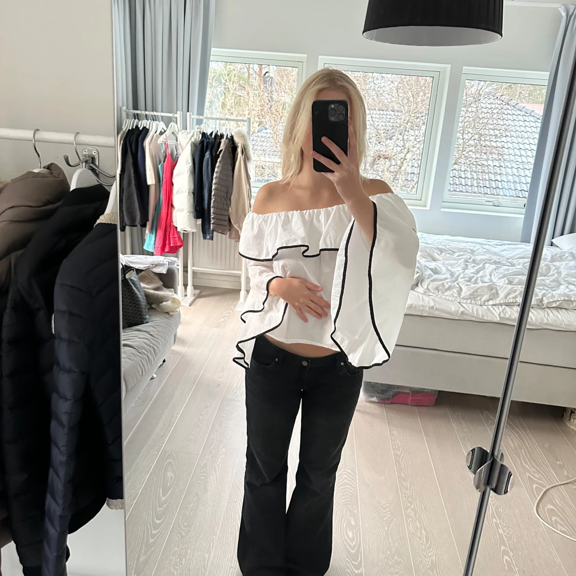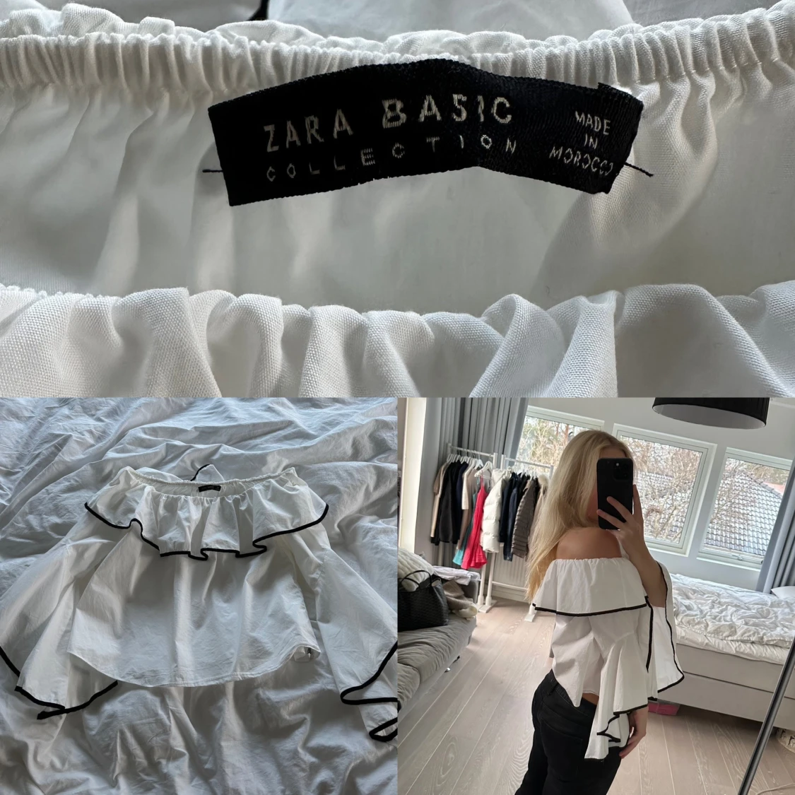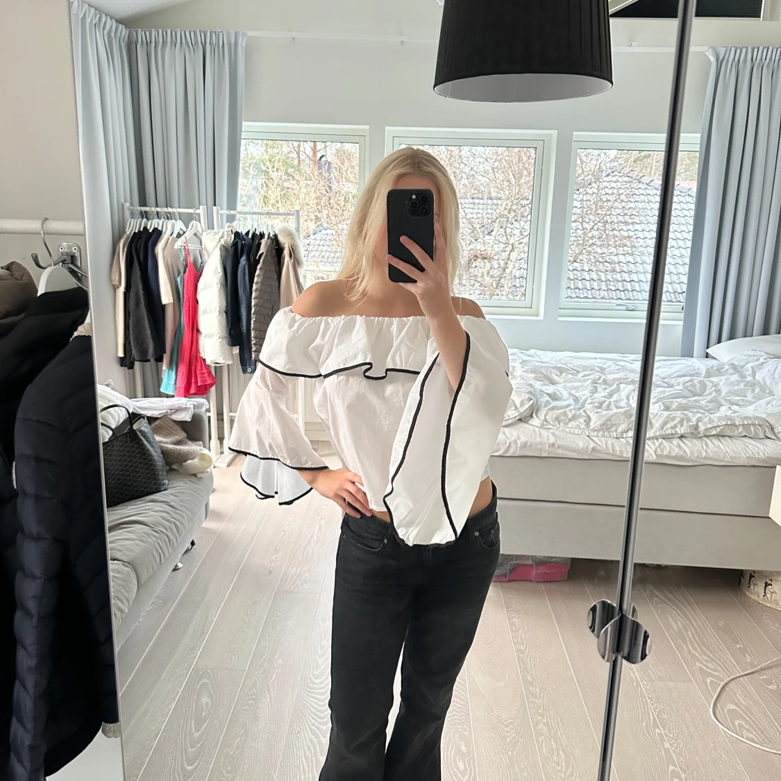 Säljer en snygg vit offshoulder blus från Zara med svarta detaljer. Blusen har volanger och vida ärmar som ger en trendig look. Perfekt för att styla med jeans eller kjol. Hittar inte storleken men uppskattar till en S. Bra skick!