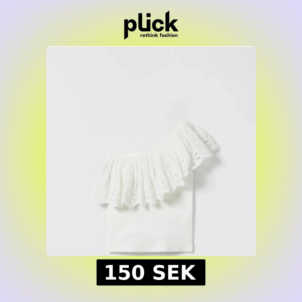 Säljer en söt vit oneshoulder topp med bred volang och broderade detaljer. Perfekt för sommarn! Skriv om du har frågor, köp gärna direkt!🩷