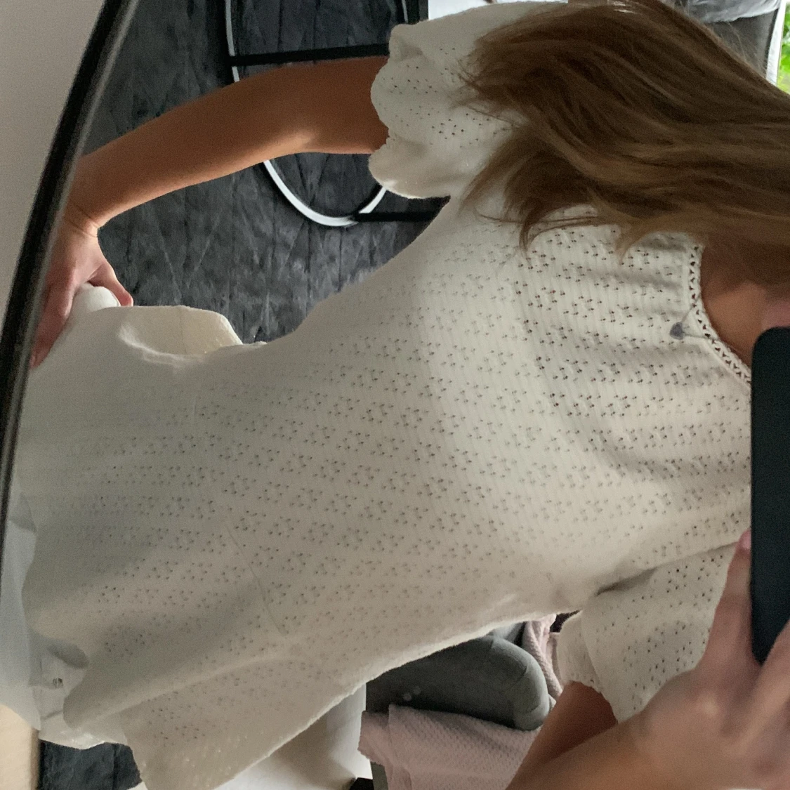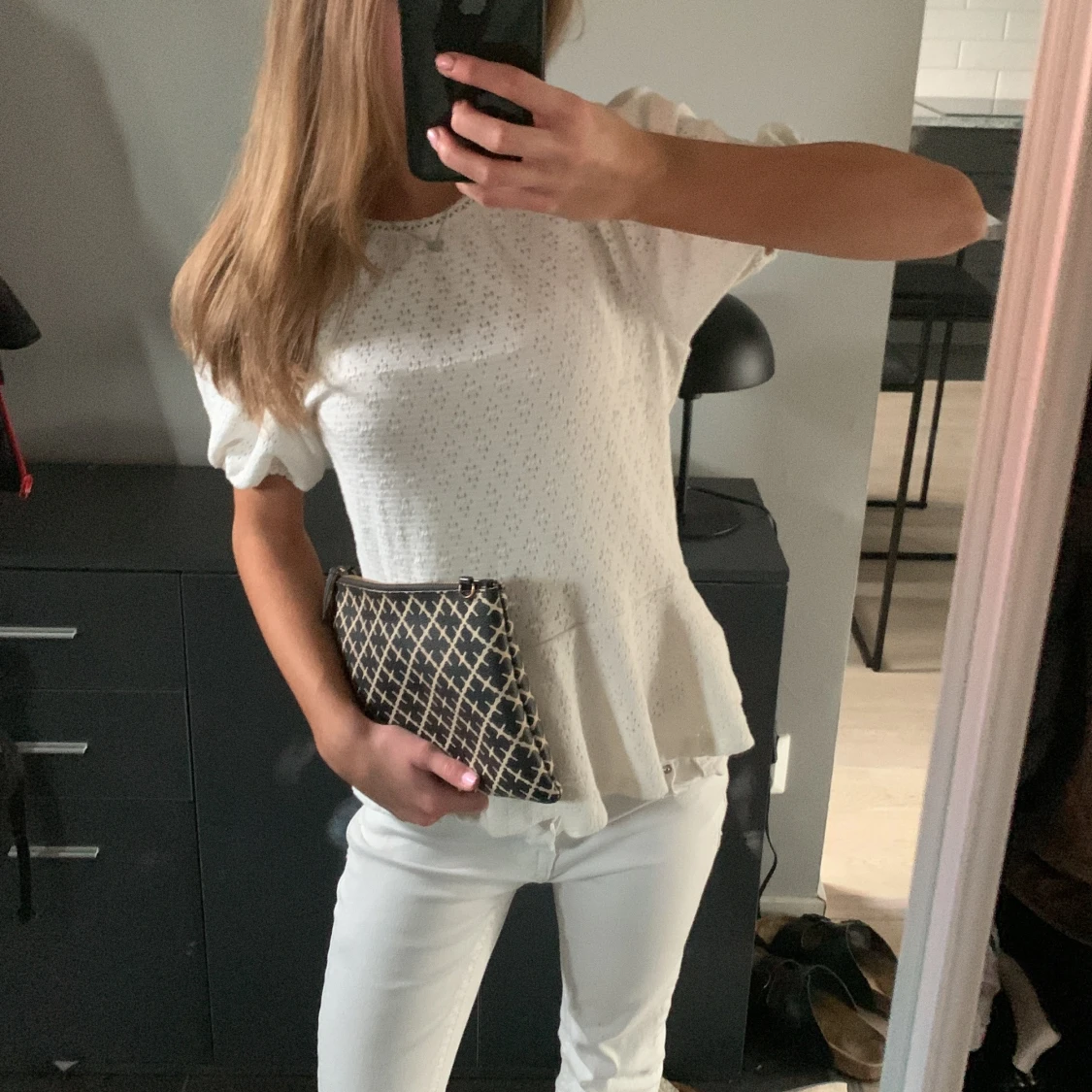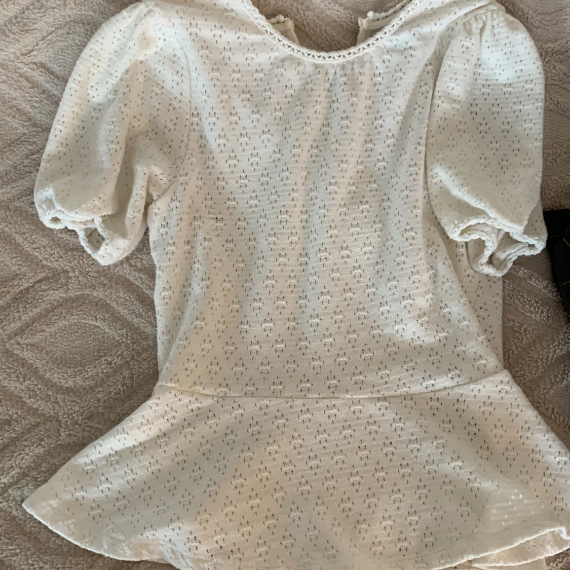 Supersöt vit blus med diskret hålmönster, puffärmar och volang nertill. Blusen har rund halsringning med liten spetskant och är i mjuk bomull. Perfekt för dig som gillar romantisk och feminin stil. Jätte fint skick 🤍storlek XS.