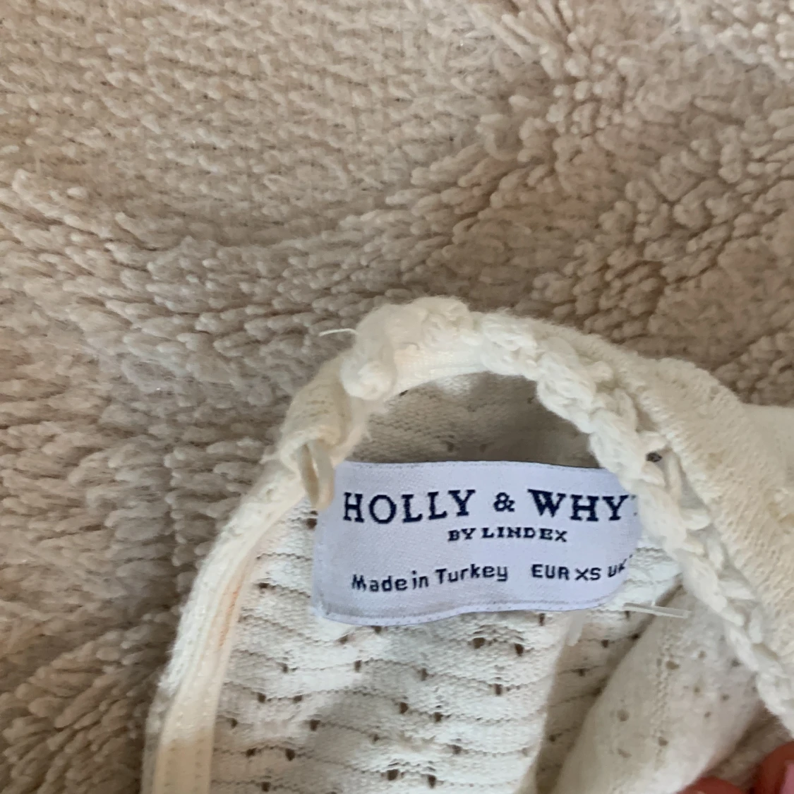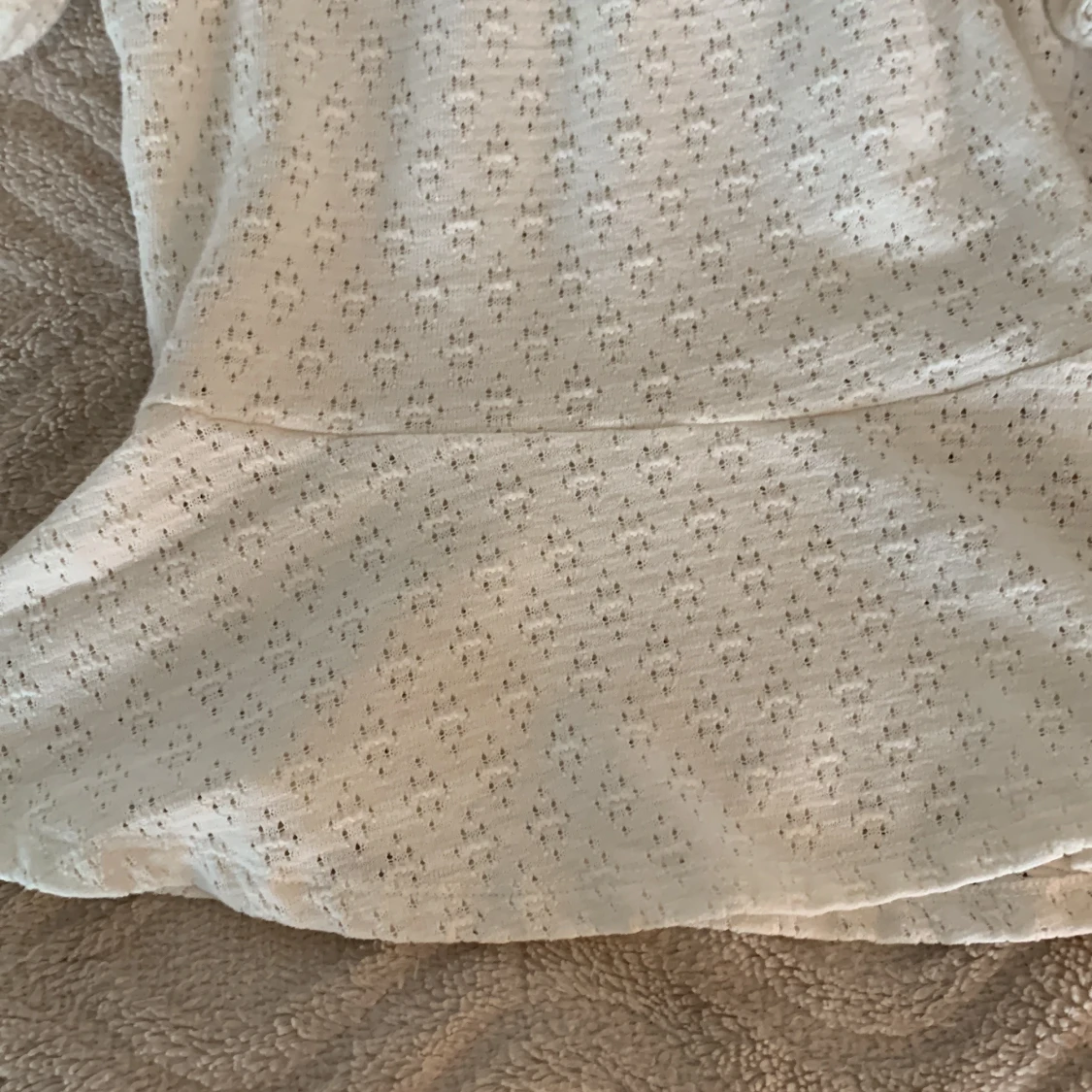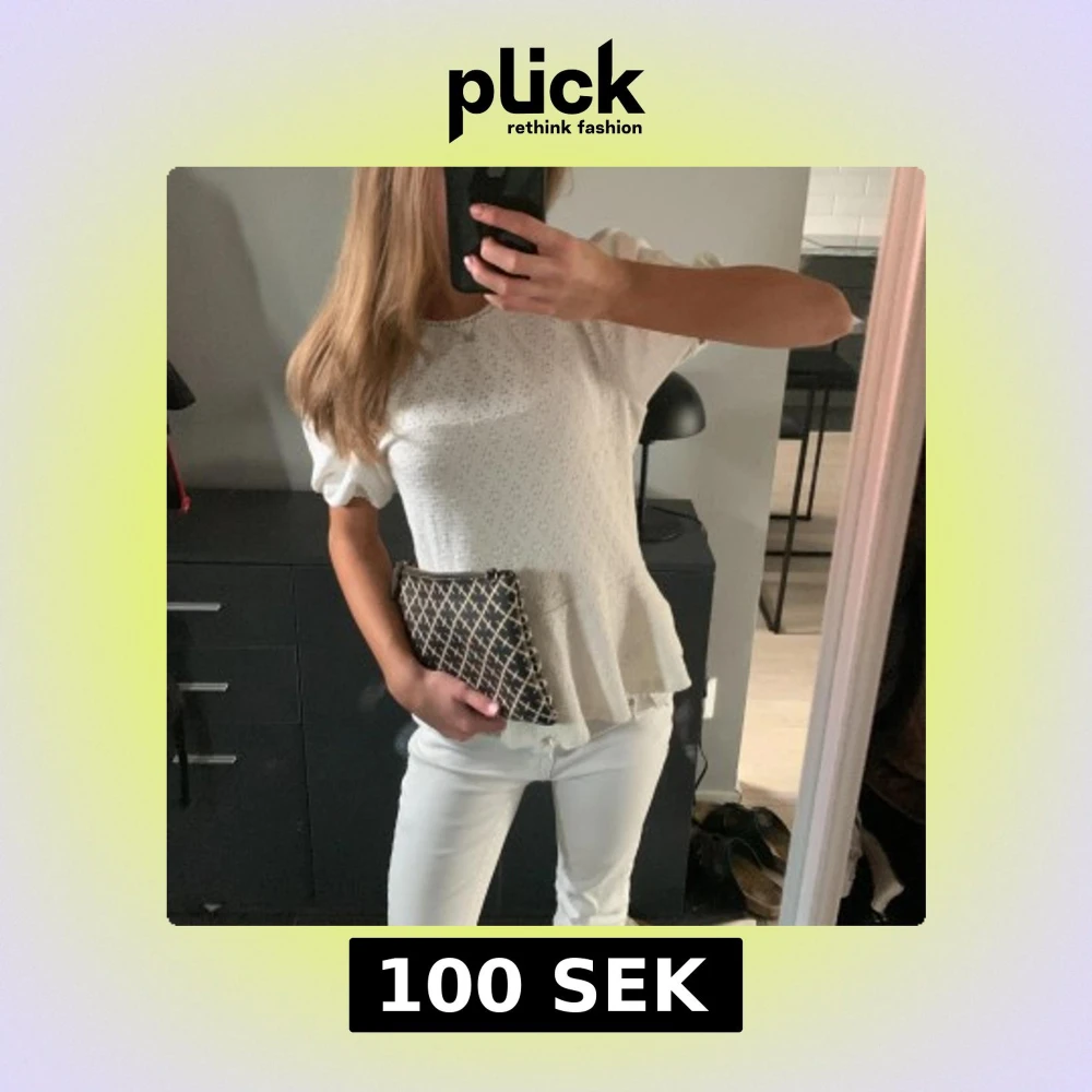 Supersöt vit blus med diskret hålmönster, puffärmar och volang nertill. Blusen har rund halsringning med liten spetskant och är i mjuk bomull. Perfekt för dig som gillar romantisk och feminin stil. Jätte fint skick 🤍storlek XS.