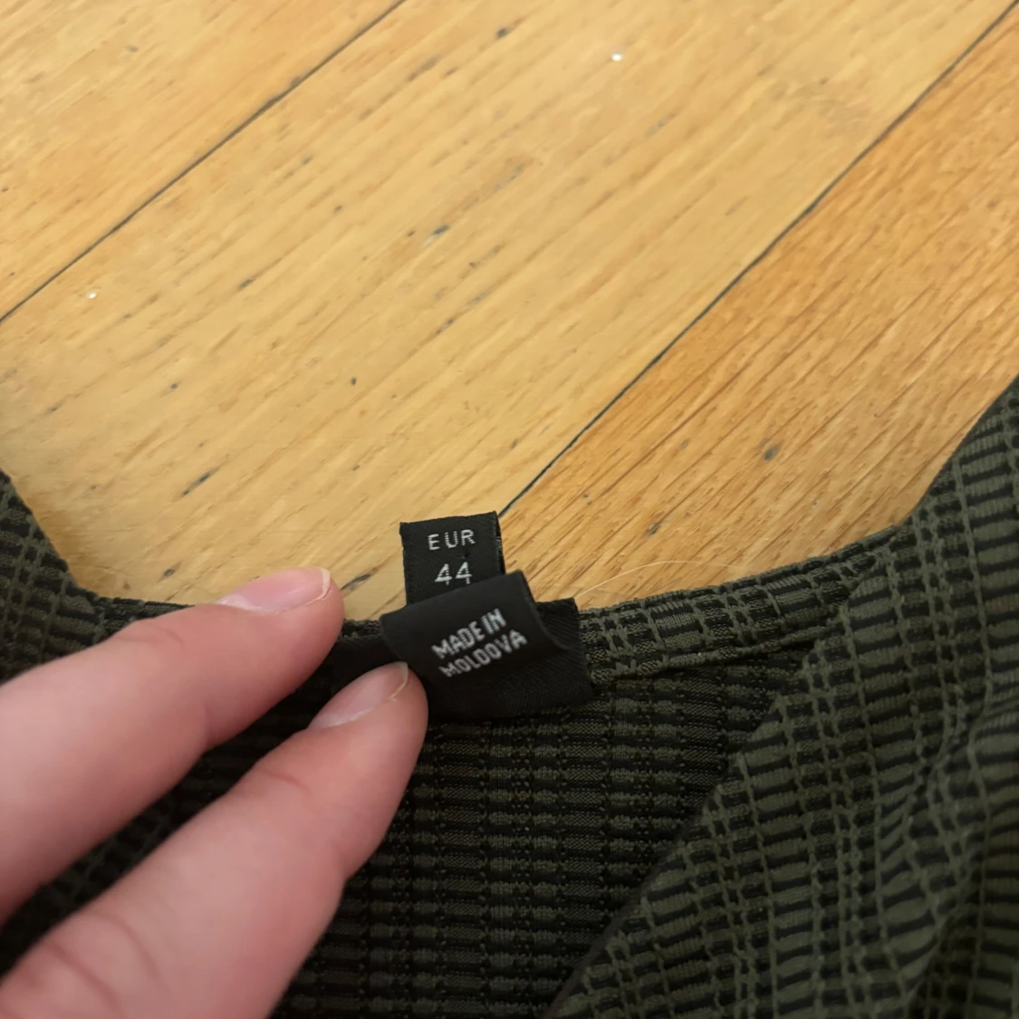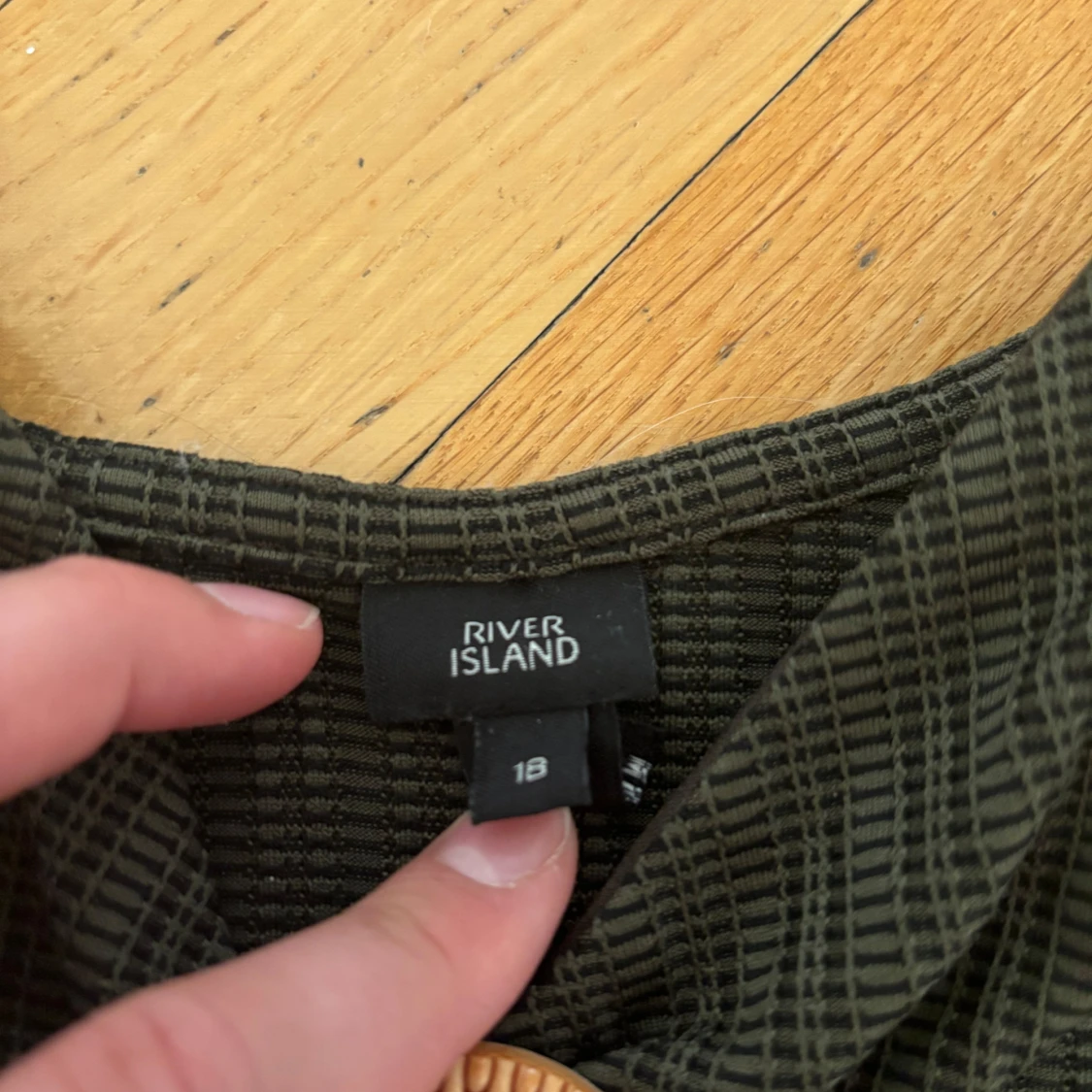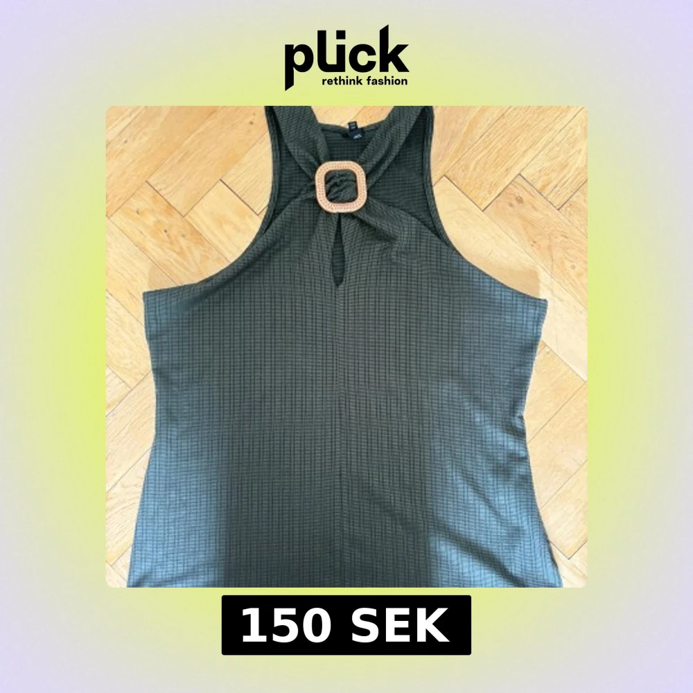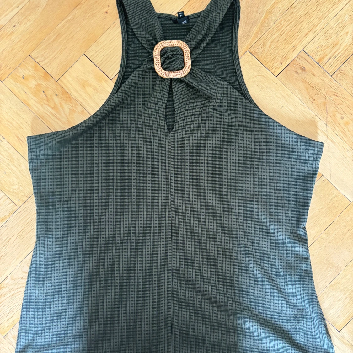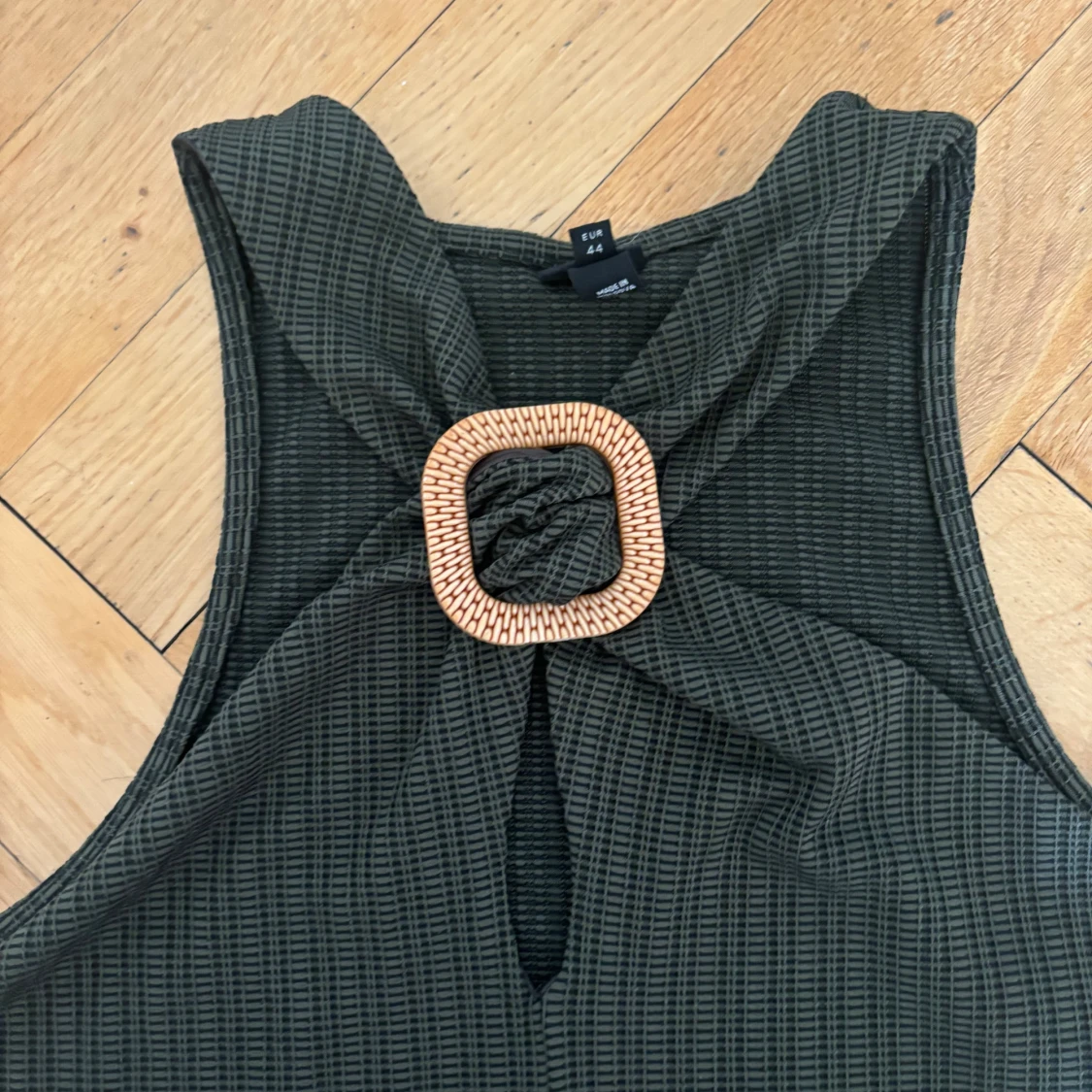 Snygg mörkgrön ärmlös topp från River Island med diskret rutigt mönster. Toppen har ett dekorativt spänne framtill vid halsen och en liten öppning under spännet. Perfekt för att lyfta din outfit med en unik detalj.