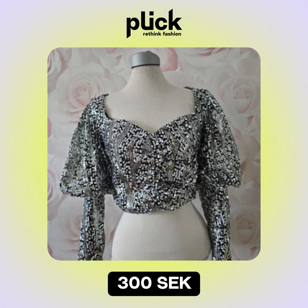 Hjärtformad kort topp med puffärmar. Finns dragkedja under ena ärmen. Silvriga paljetter. Skit snygg, men inte på min platta byst 😭 Älskar den!