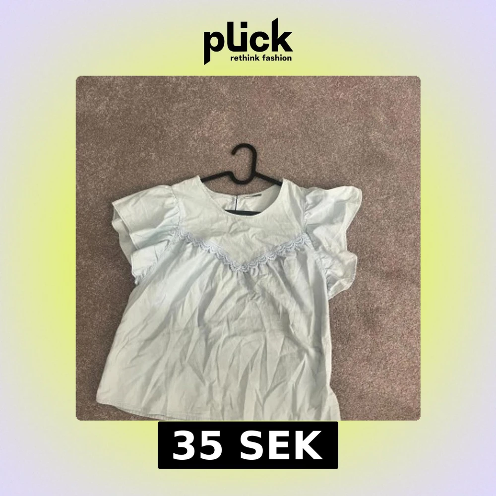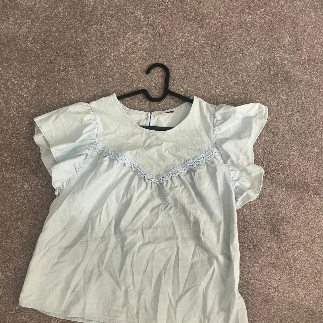 Söt ljusblå blus med korta volangärmar och rund hals. Framtill finns en dekorativ spetsdetalj i samma färg som ger en extra touch. Perfekt för dig som gillar romantisk och feminin stil.