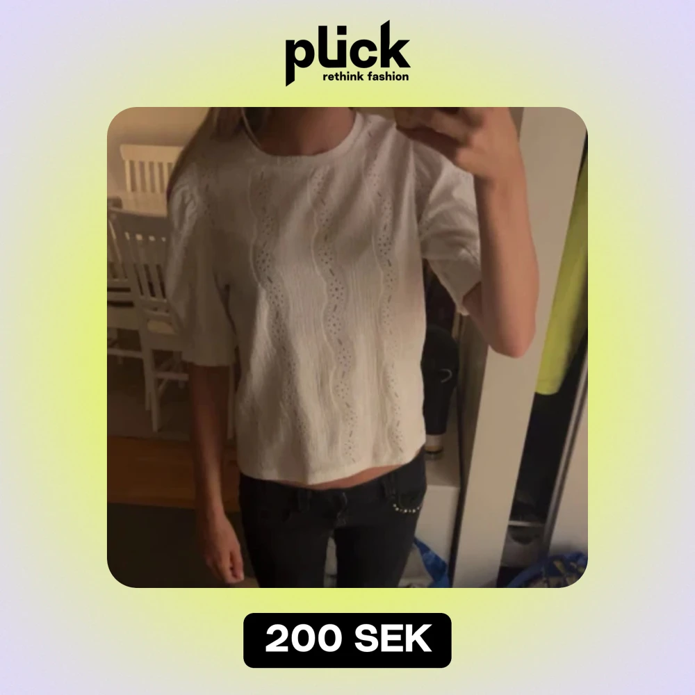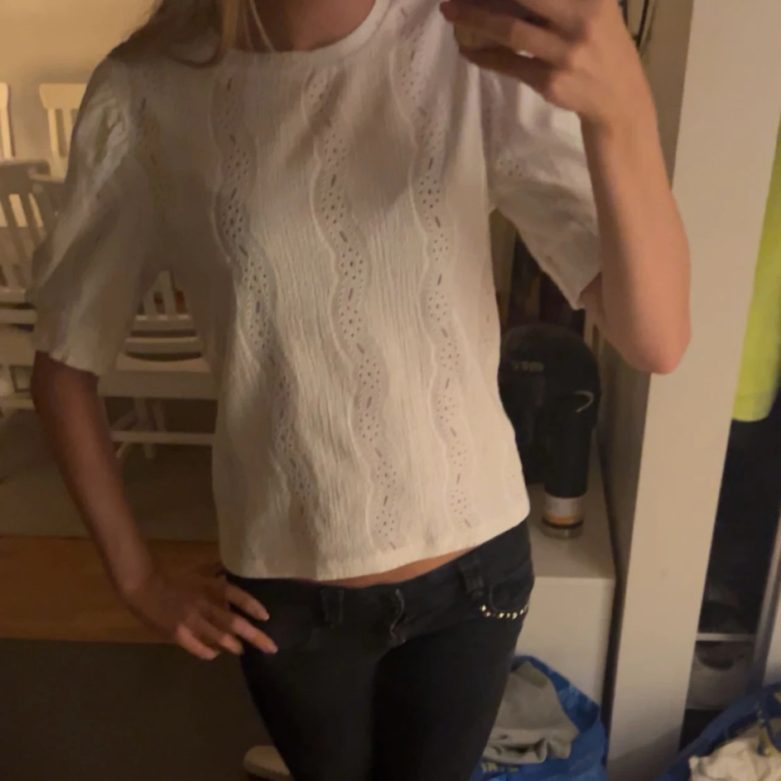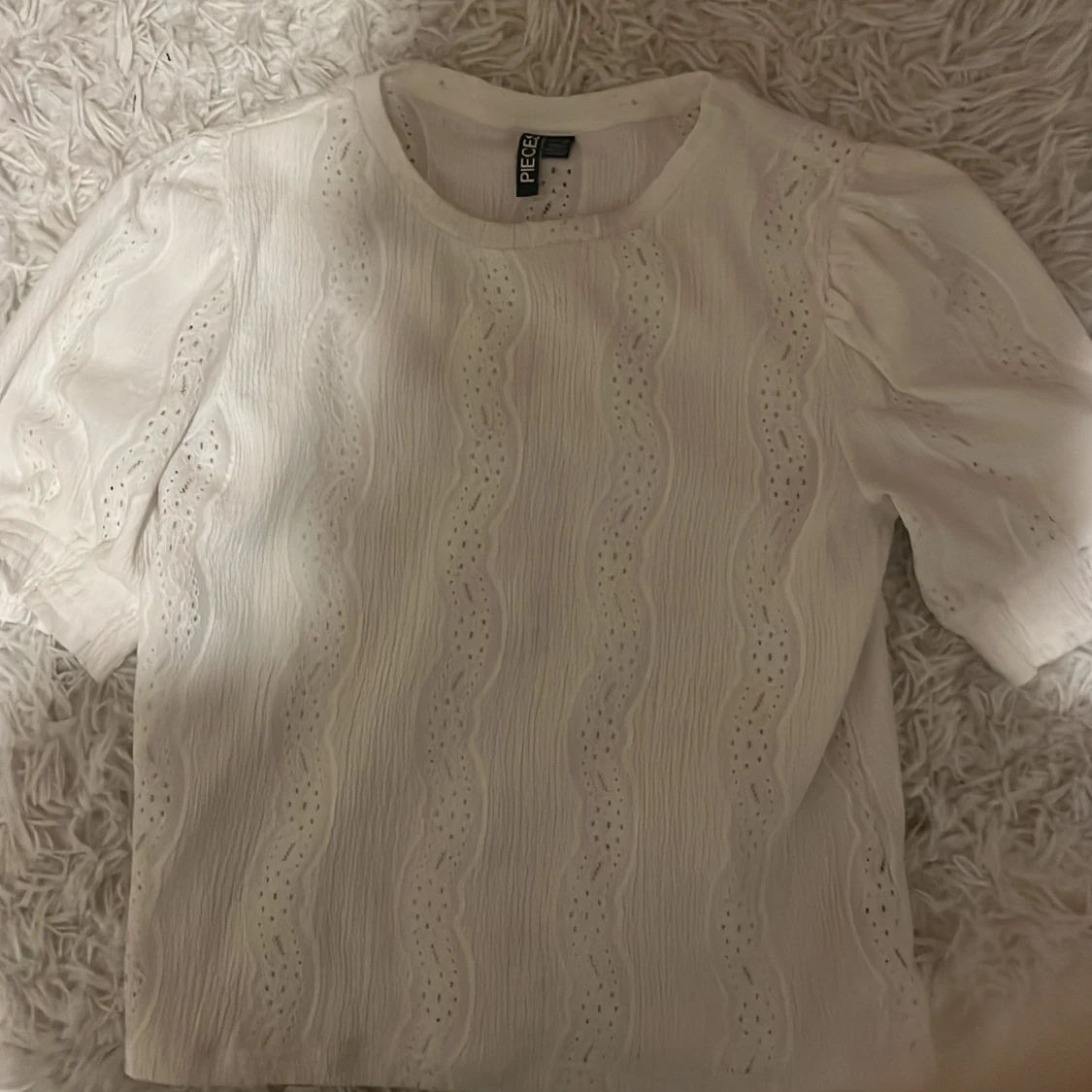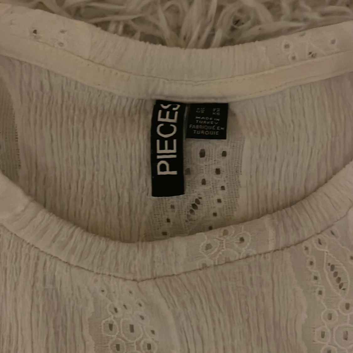 Säljer en superfin vit blus från Pieces i storlek XS. Blusen har ett vågigt mönster och är gjord i ett lätt och luftigt material, perfekt för vår och sommar. Den har korta ärmar och en rund halsringning. Passar både till vardags och fest!