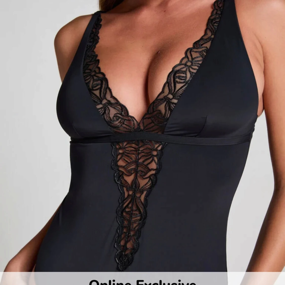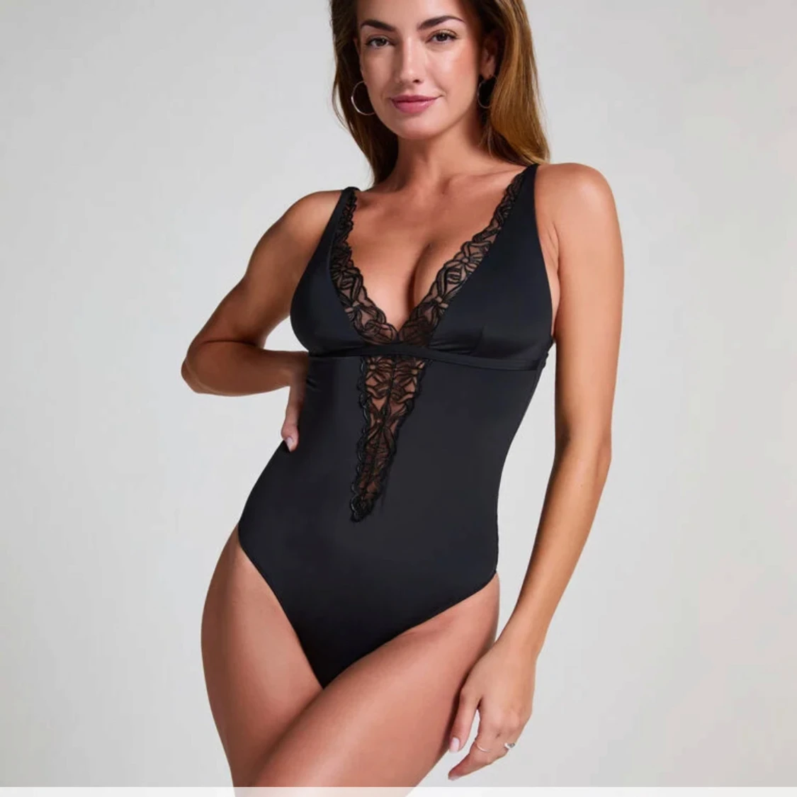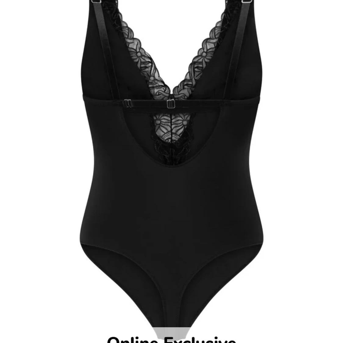 Svart body med djup v-ringning och transparent spetsdetalj framtill. Justerbara axelband och medel benskärning. Snyggt broderat spetsmönster längs urringningen och mitt fram. Perfekt för dig som vill ha en statement-piece i garderoben. Ej använd då jag köpte fel storlek.