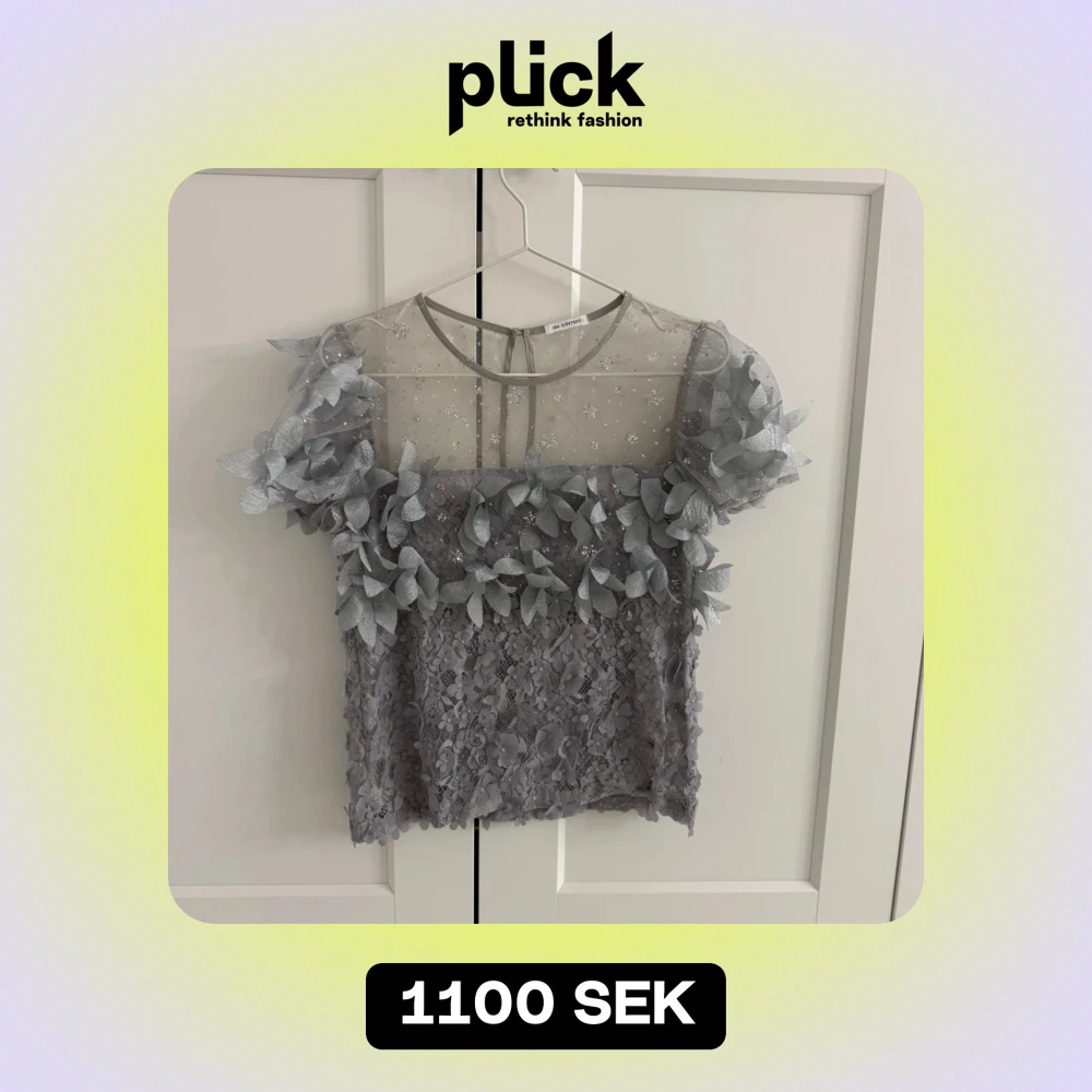 Säljer en superfin grå blus med blommiga spetsdetaljer och korta ärmar. Den har en transparent överdel med små stjärnor och blommor, vilket ger en romantisk känsla. Perfekt för festliga tillfällen eller en utekväll. Passar bra till både kjol och byxor!