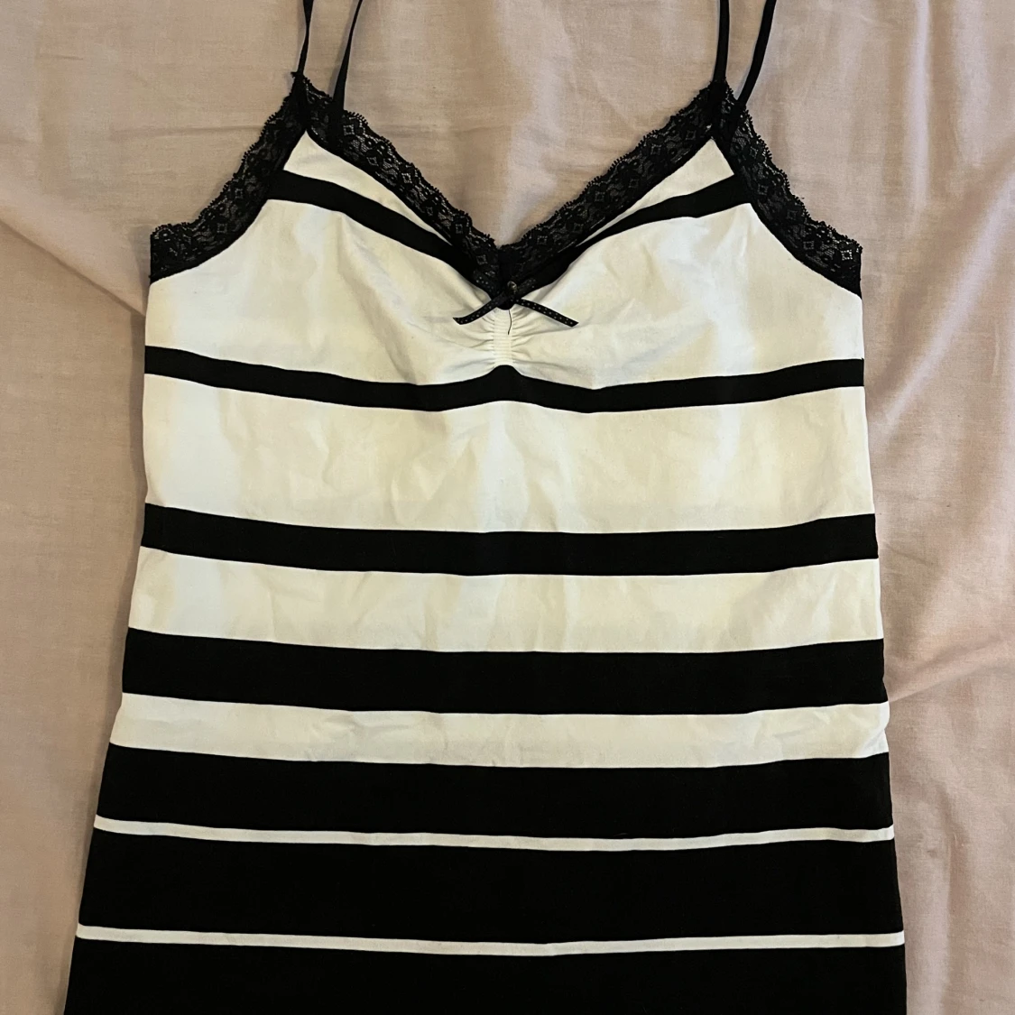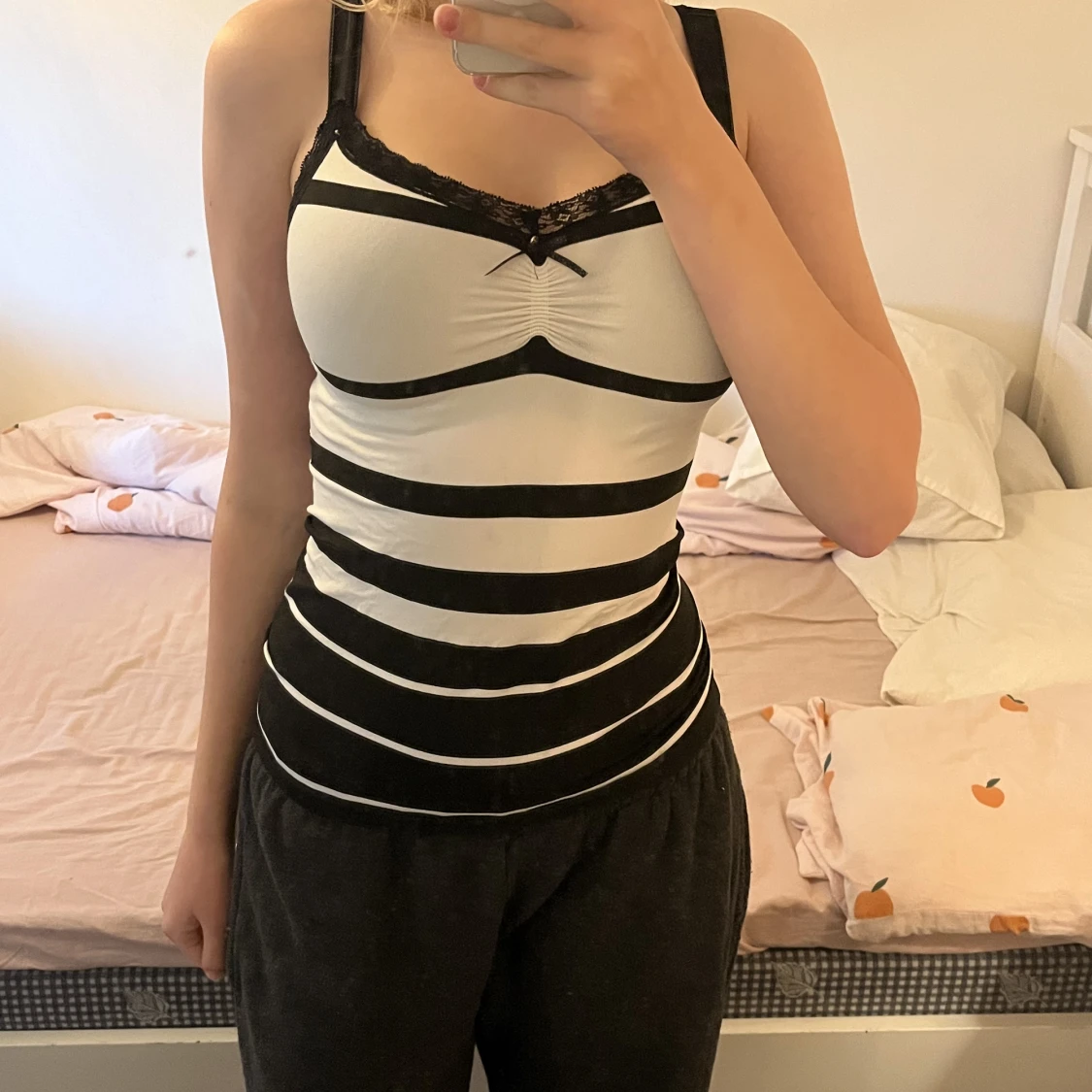 jättefint randigt linne med den sötaste rosetten 🥹 köpt secondhand så vet ej hur mycket den är använd, men den är i typ perfekt skick! storlek säger L men, men kan passa även en S. väldigt stretchig.