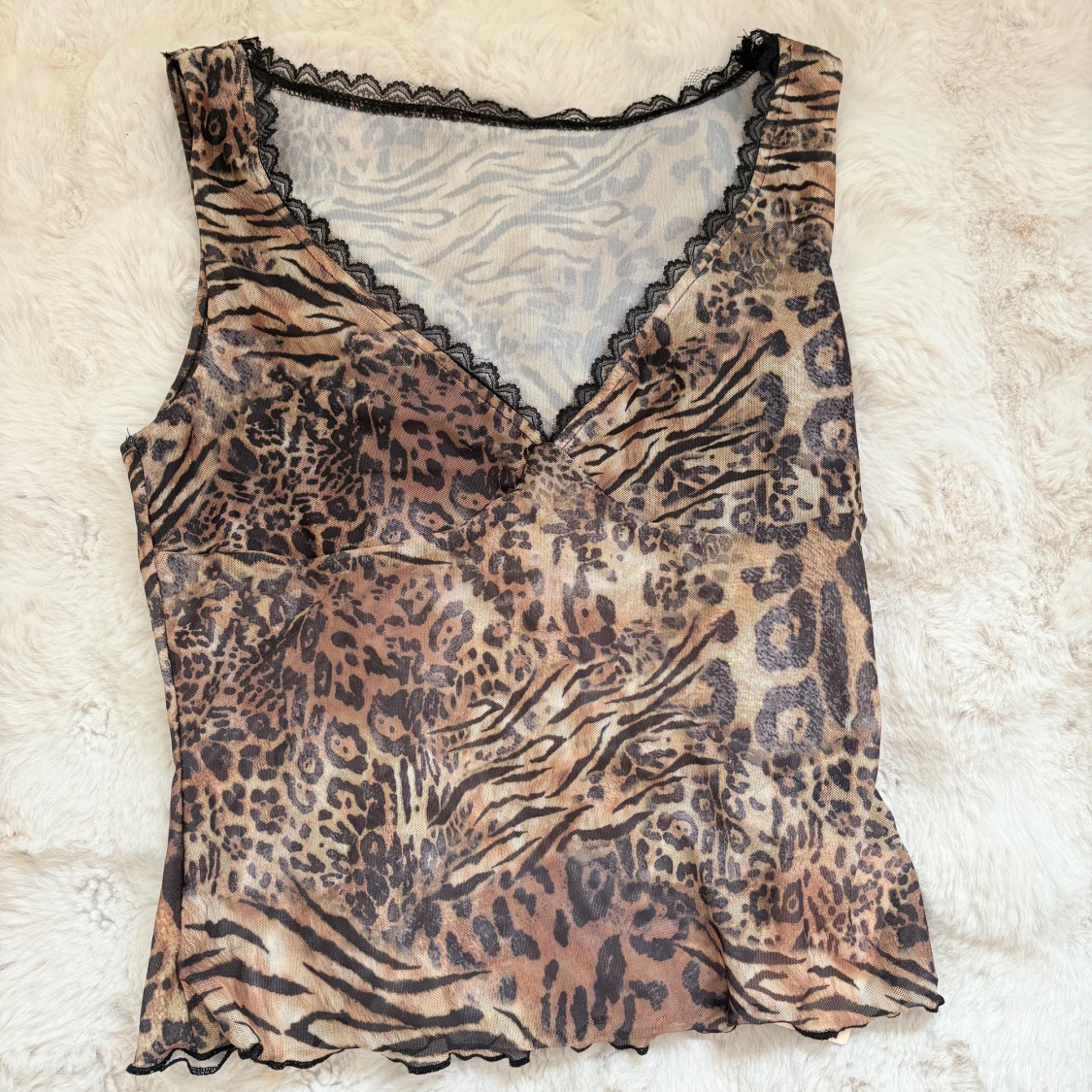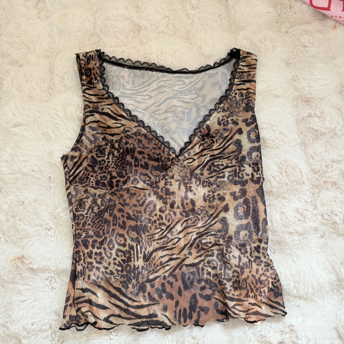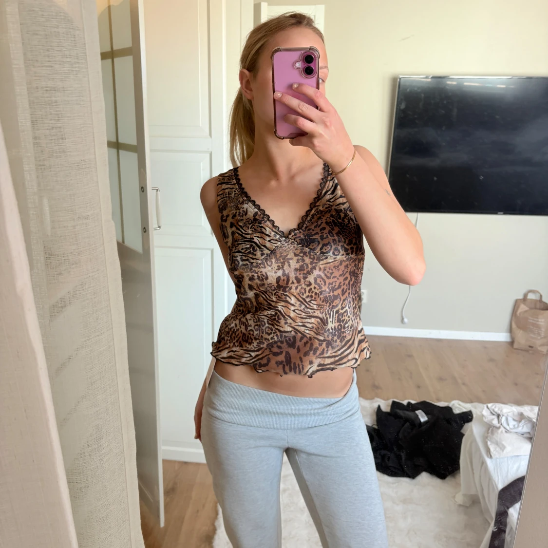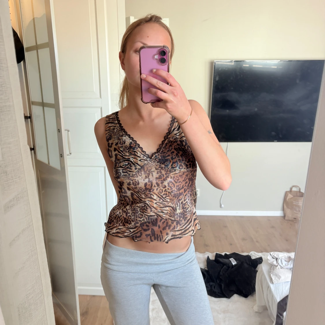 Säljer en croppad linnetopp med leopardmönster och svarta spetsdetaljer längs v-ringningen. Super fint! Lapp kvar, aldrig använd
