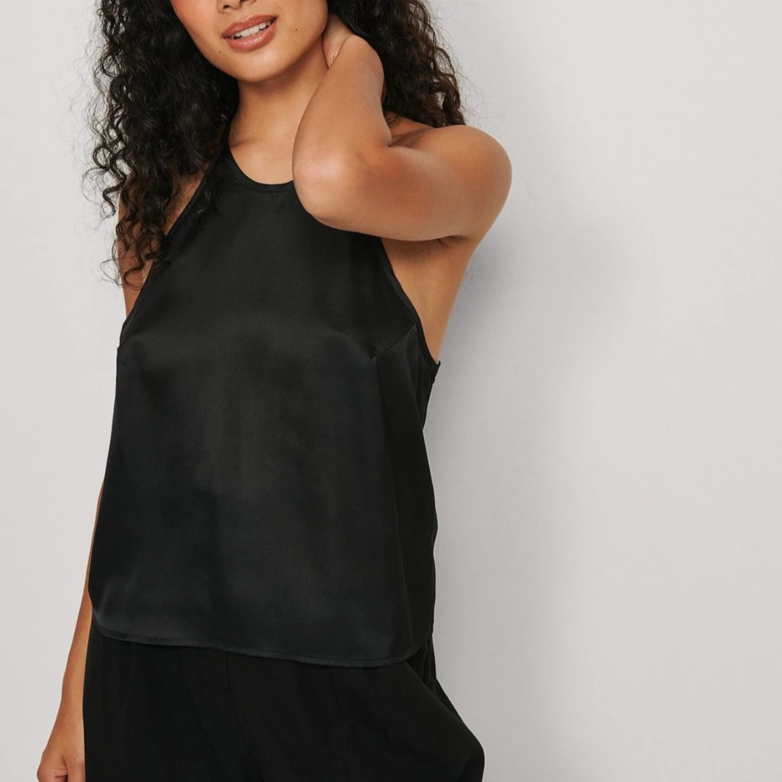 Snygg svart ärmlös topp med spetsdetaljer och korsade band i ryggen. Perfekt för en stilren look. Toppen har en elegant och enkel design som passar till många olika tillfällen.