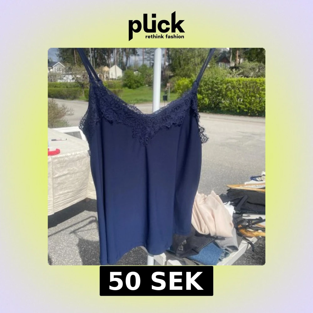 Snygg mörkblå linnetopp med tunna axelband och dekorativ spets längs v-ringningen. Perfekt för varma dagar eller som lager under en kavaj. Toppens material känns lätt och luftigt.