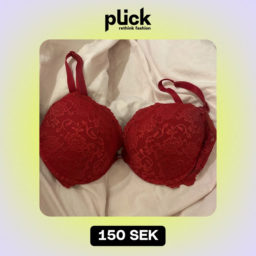 Snygg röd pushup bh i spets med justerbara axelband och vadderade kupor. Använd 1 gång men råkade köpa fel storlek❤️ (såklart tvättad)