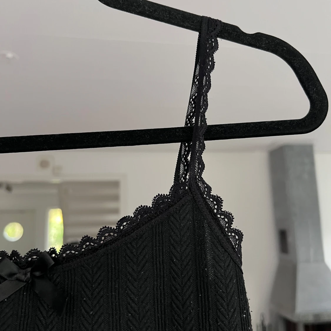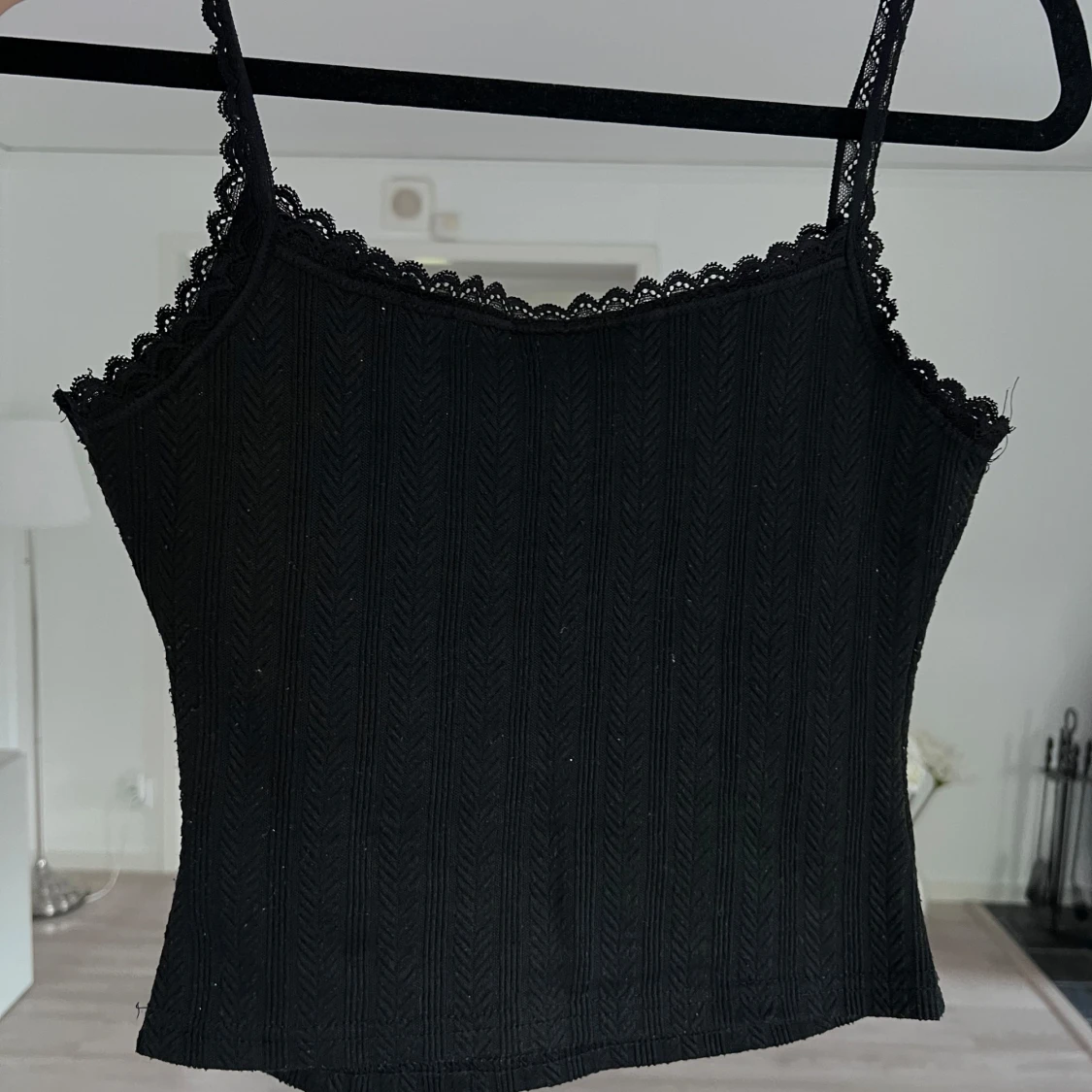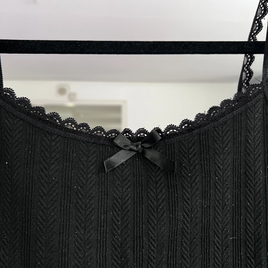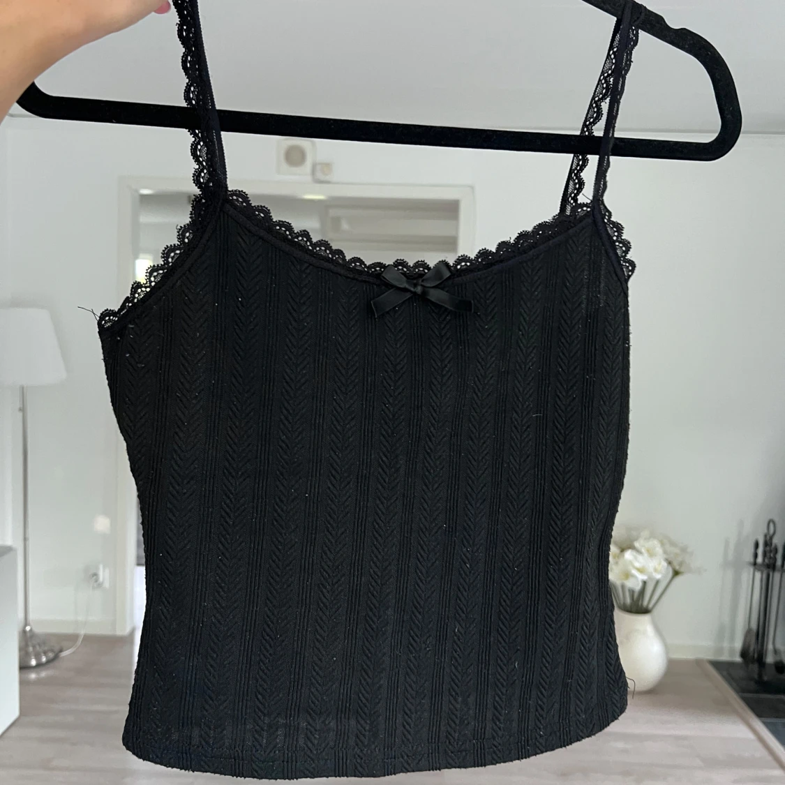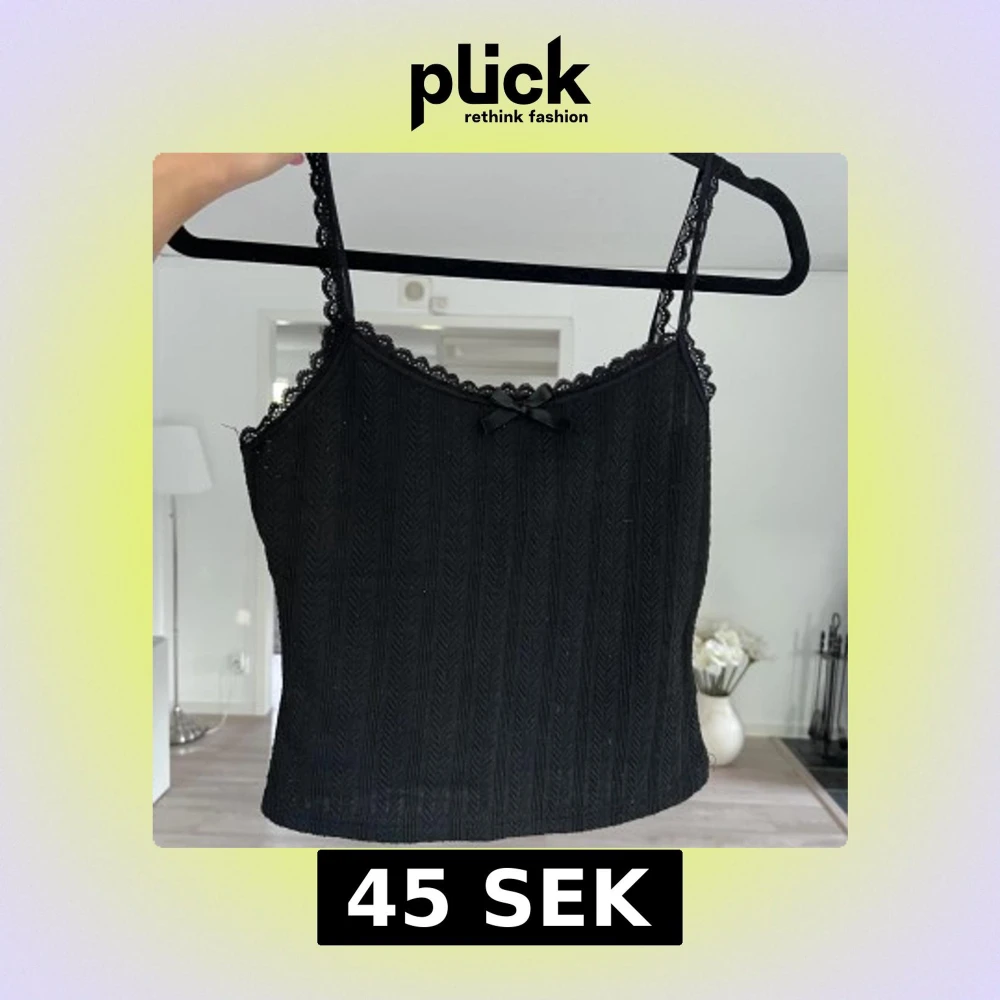 Supersöt svart linnetopp med smala stretchiga axelband och spetskant längs urringningen. Toppen har en liten rosett framtill och ett ribbat mönster som ger en snygg struktur. Perfekt att styla med jeans eller kjol för en trendig look. Blivit en aning nopprig. 💘 Önskar du veta exakta mått? Tveka inte att höra av dig!