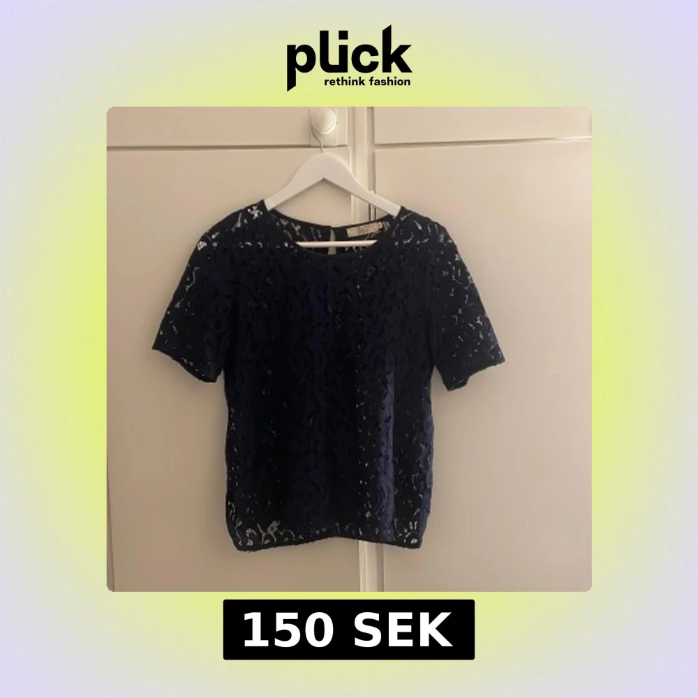 Säljer en mörkblå blus i spets från 365. Blusen har korta ärmar, rund halsringning och knappar längs ryggen. Perfekt för dig som gillar detaljer och ett elegant spetsmönster.