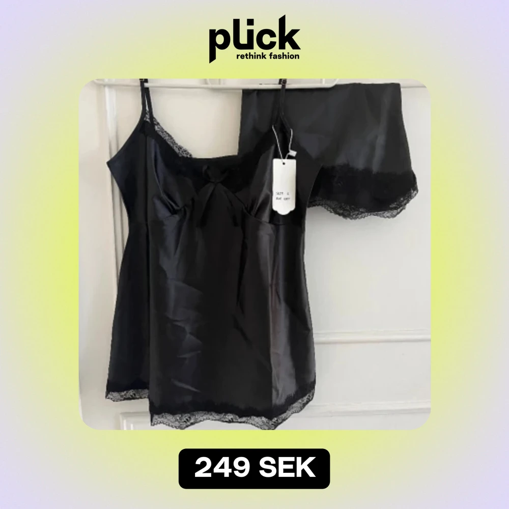 Pyjamasset från Missäy i svart satin med spetsdetaljer❣️verkligen jättefint o säljer endast då strl va fel, lapp är kvar o bara testat❤️
