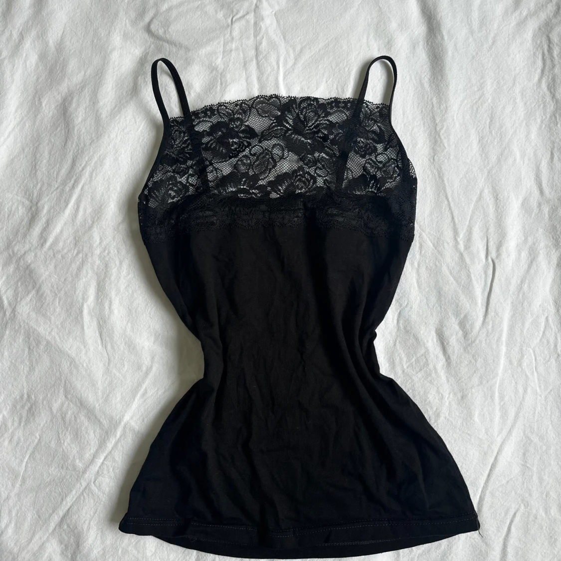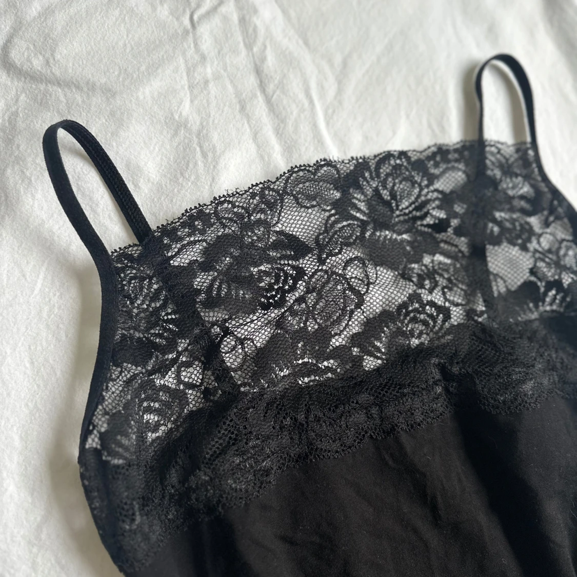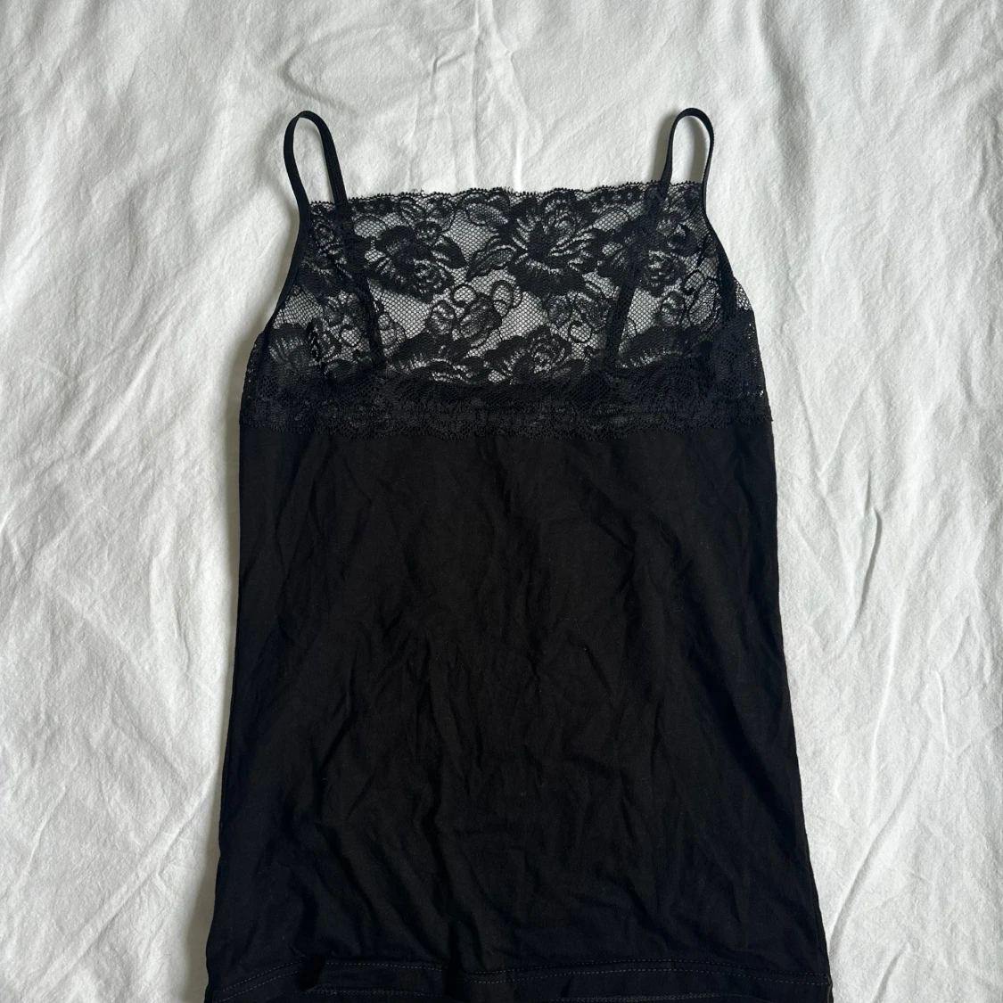 Svart linne med tunna axelband och en snygg spets upptill med blommigt mönster. Vid köp av flera varor får du rabatt 💛