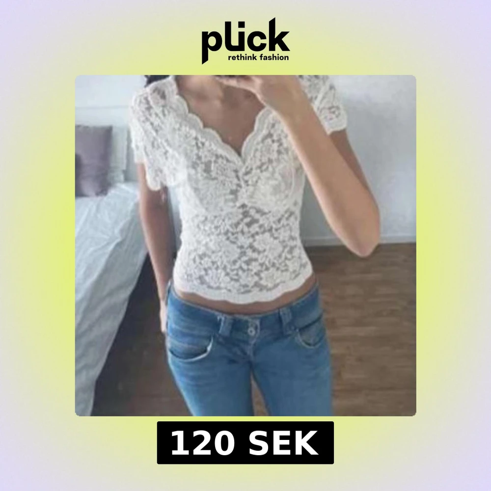 Supersöt vit blus i spets från designbysi med korta ärmar och v-ringad hals. Blusen har ett blommigt spetsmönster. perfekt till jeans eller kjol. Onsize.