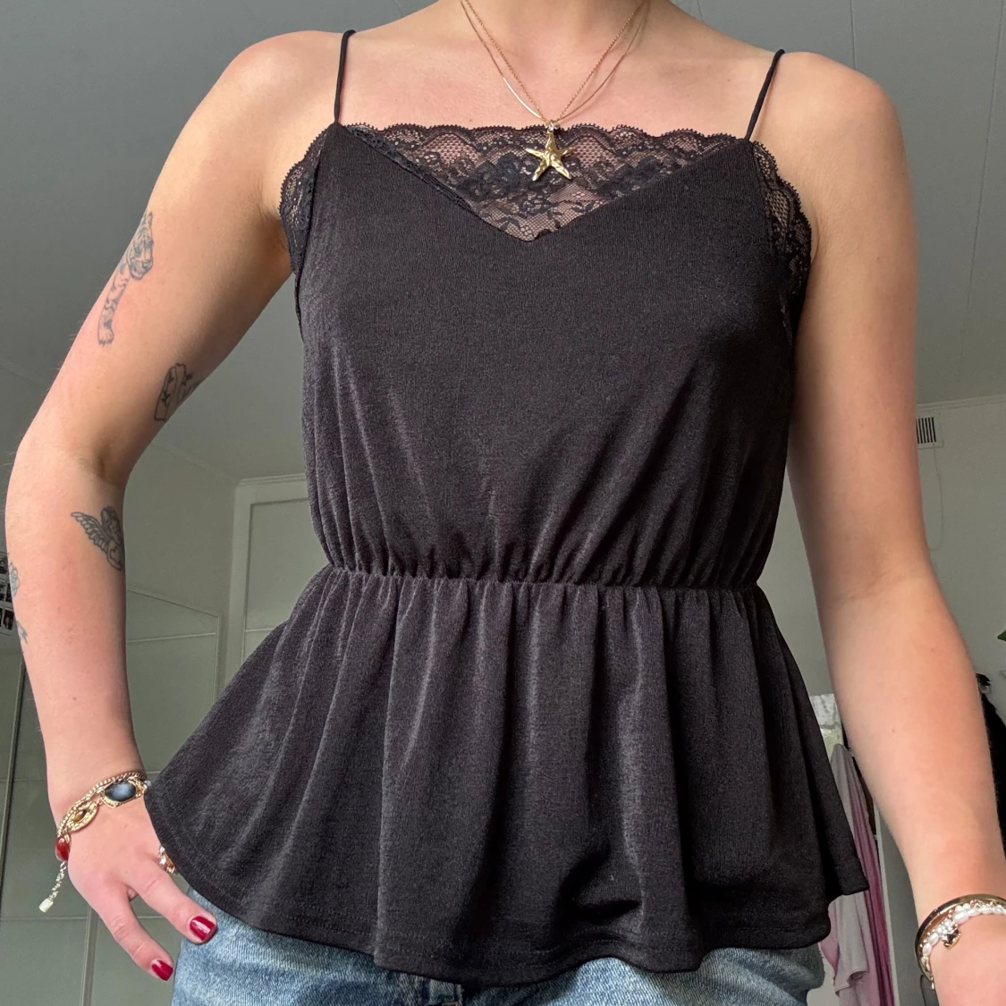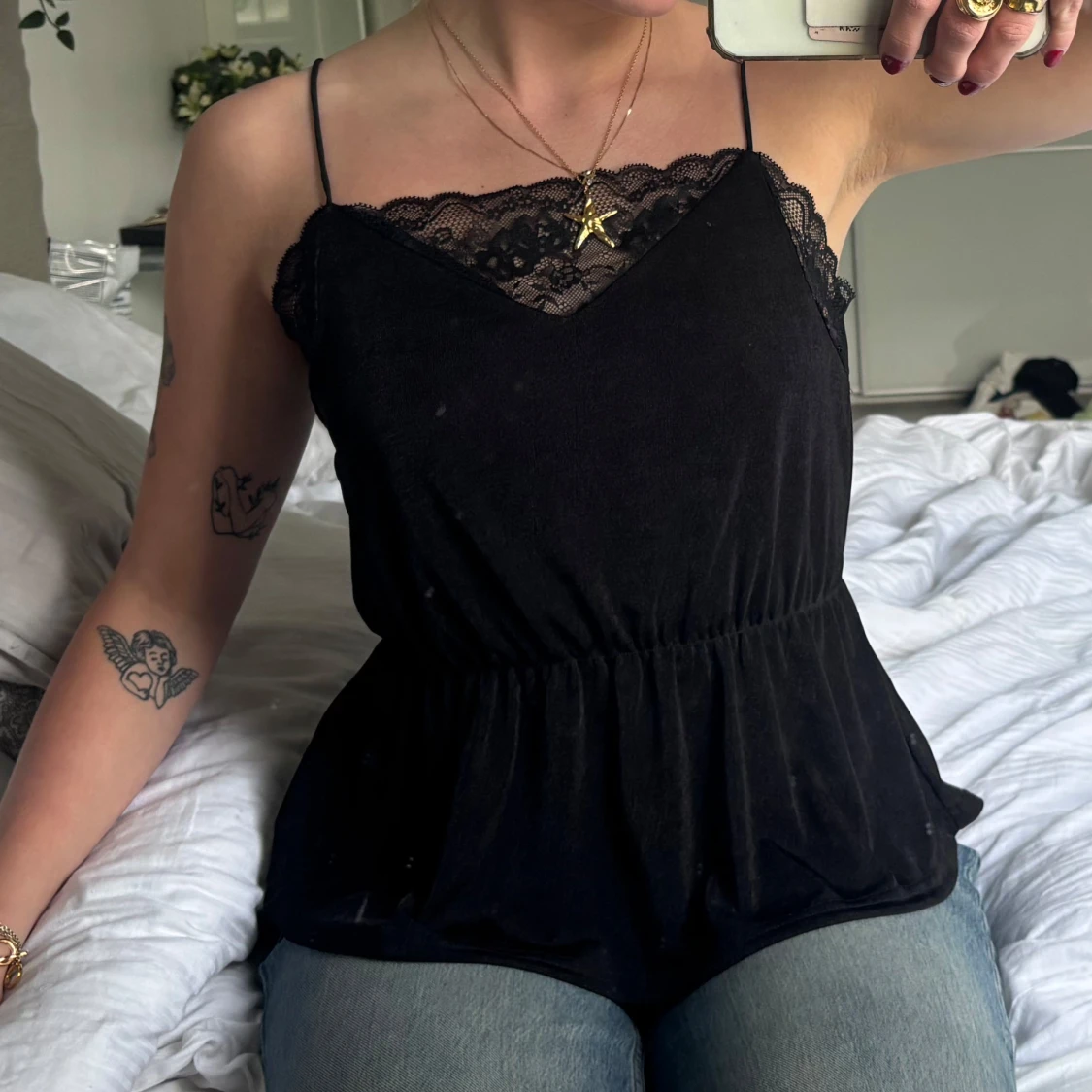 Svart knappt använt linne med resorband i midjan och en fin spets upptill🖤❤️