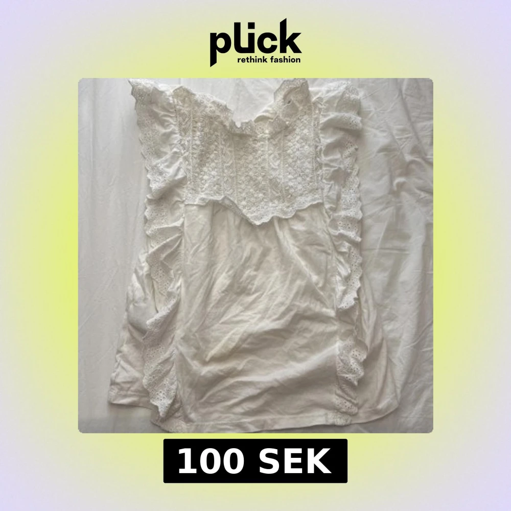 Säljer en söt vit blus från MNG med spetsdetaljer upptill och längs sidorna. Blusen har volanger och v-ringning både fram och bak. Perfekt för dig som gillar romantisk stil och fina detaljer. Knappen där bak är sönder därav priset