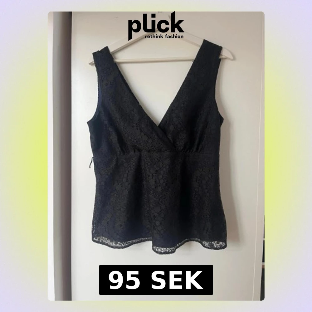 Säljer en svart blus i spets med omlottdesign och djup v-ringning. Toppen är ärmlös och har en figurnära passform med dragkedja i sidan för enkel påklädning. Spetsmaterialet ger en elegant känsla och den är perfekt för dig som vill ha något stilrent men ändå lite extra.