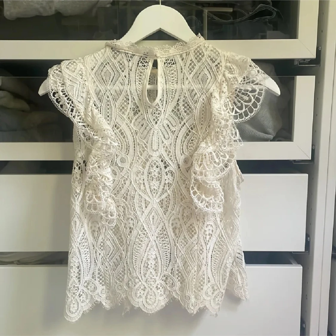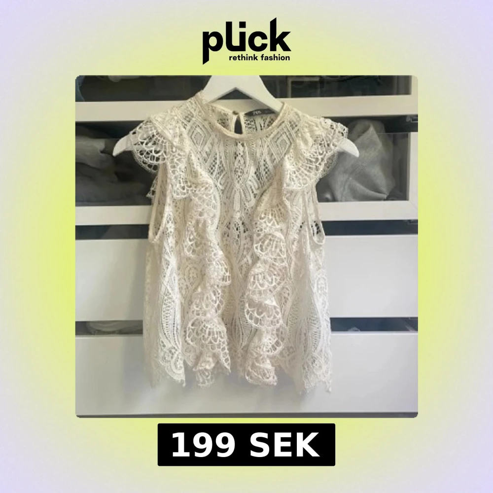Superfin vit blus från Zara i spets med vackra volangdetaljer och genombrutet mönster. Ärmlös modell med rund halsringning och knapp i nacken. Perfekt för dig som gillar romantisk och bohemisk stil.