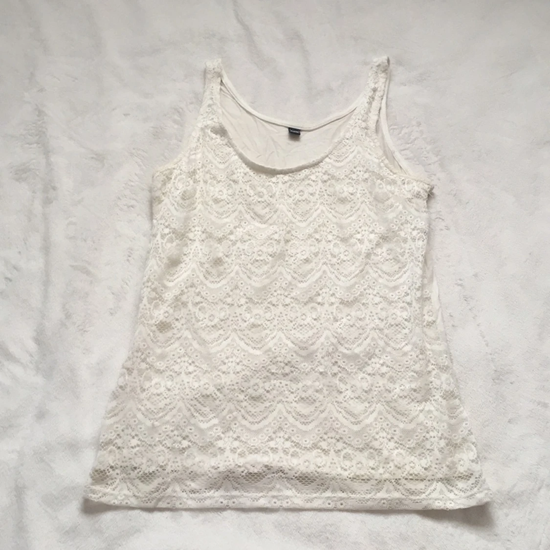 Pärlvitt linne från ett märke som heter Pimkie. Spetstyg över linnet på framsidan. Underbart skönt material som går att matcha till det mesta. Bra skick!