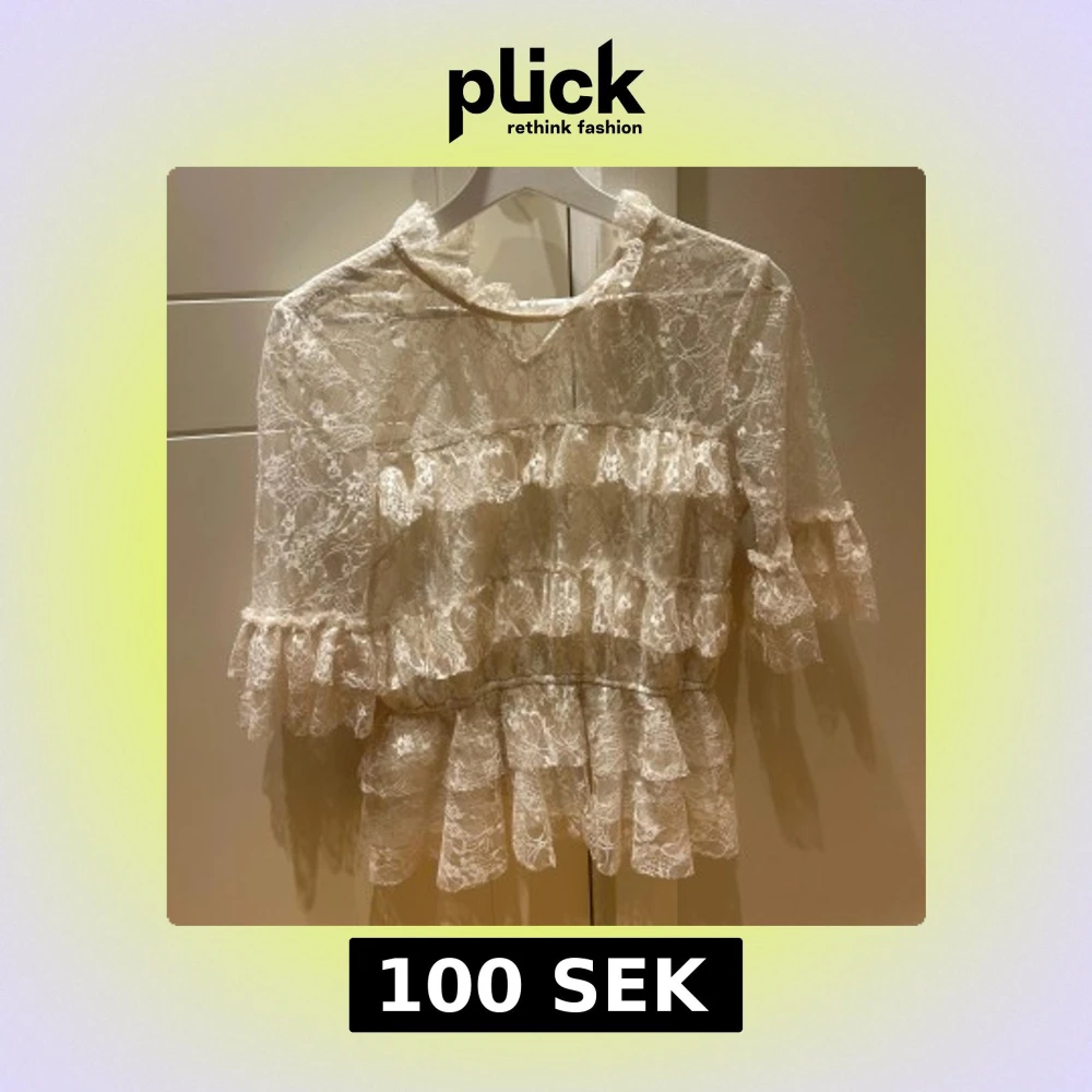 Superfin blus i ljus spets med volanger och genombrutet mönster. Blusen har trekvartsärm och hög hals med volangdetaljer. Perfekt för dig som gillar en romantisk och feminin stil.