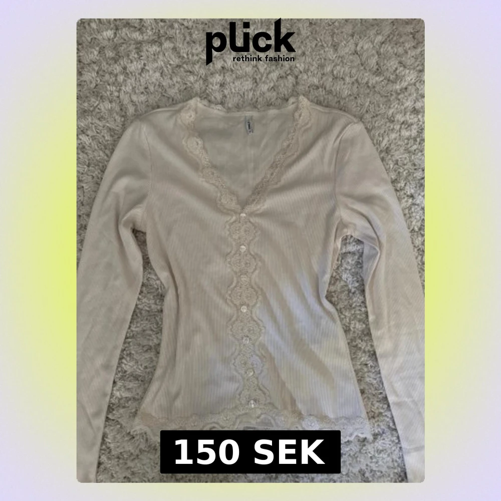 Söt beige långärmad blus med v-ringning, spetsdetaljer längs knäppningen och nederkanten samt små knappar framtill. Tunn ribbad struktur och figurnära passform. Perfekt för dig som gillar romantiska detaljer.