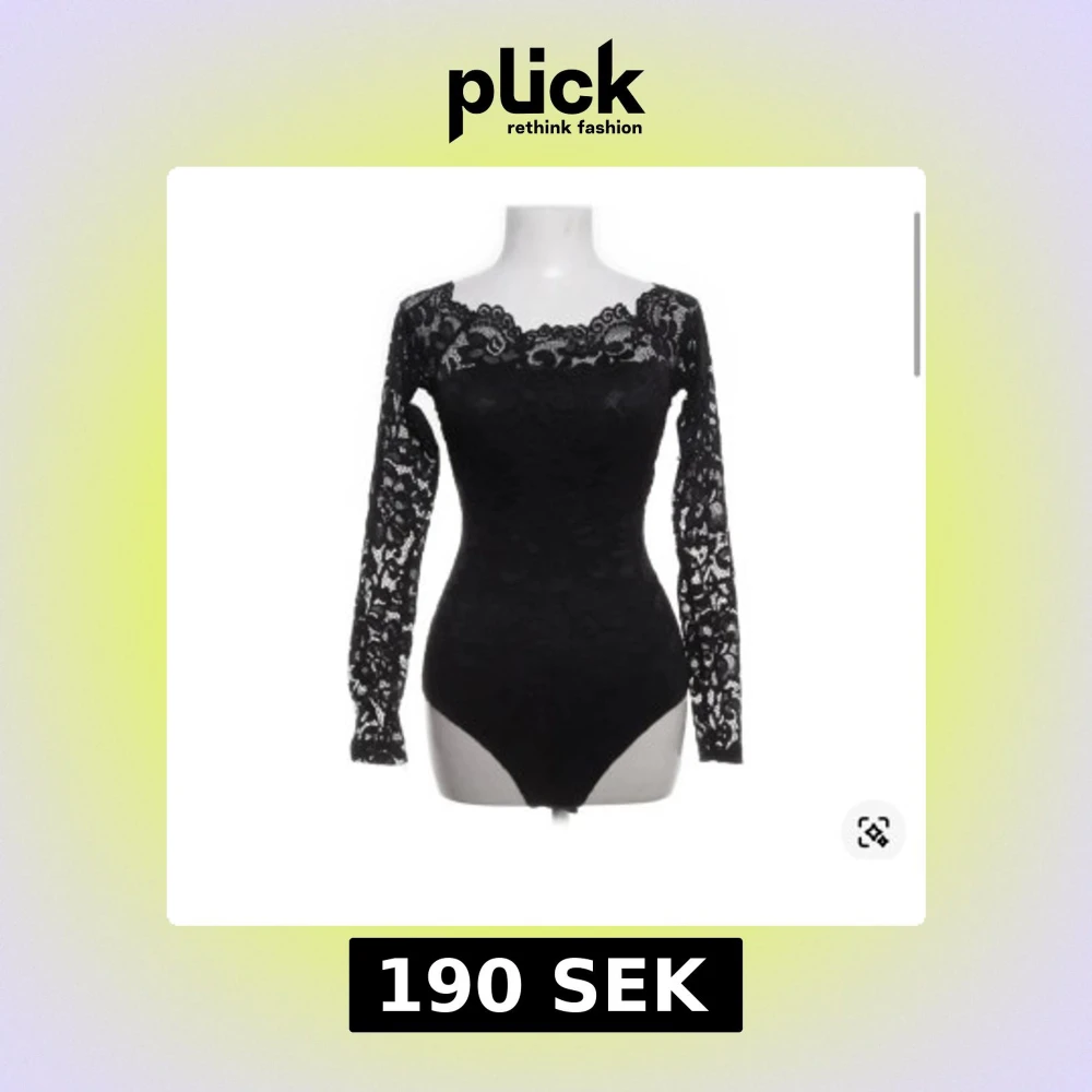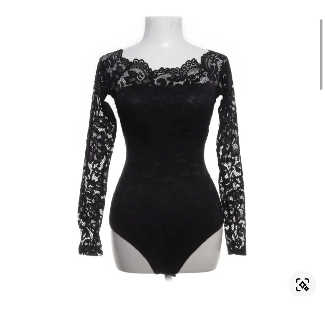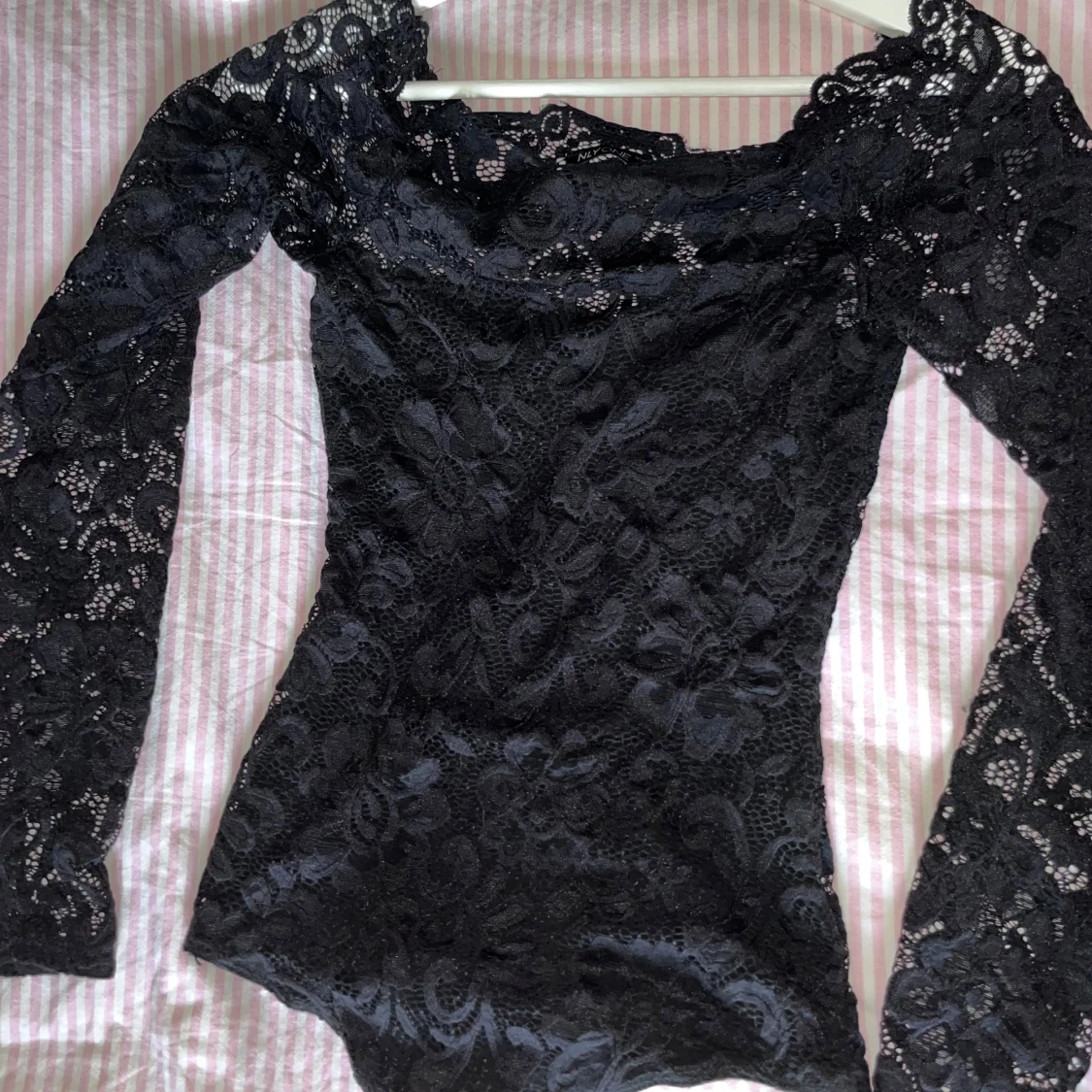 Säljer en svart body med långärmade ärmar och offshoulder-modell. Bodyn har blommigt spetsmönster och en snygg, figurnära passform.