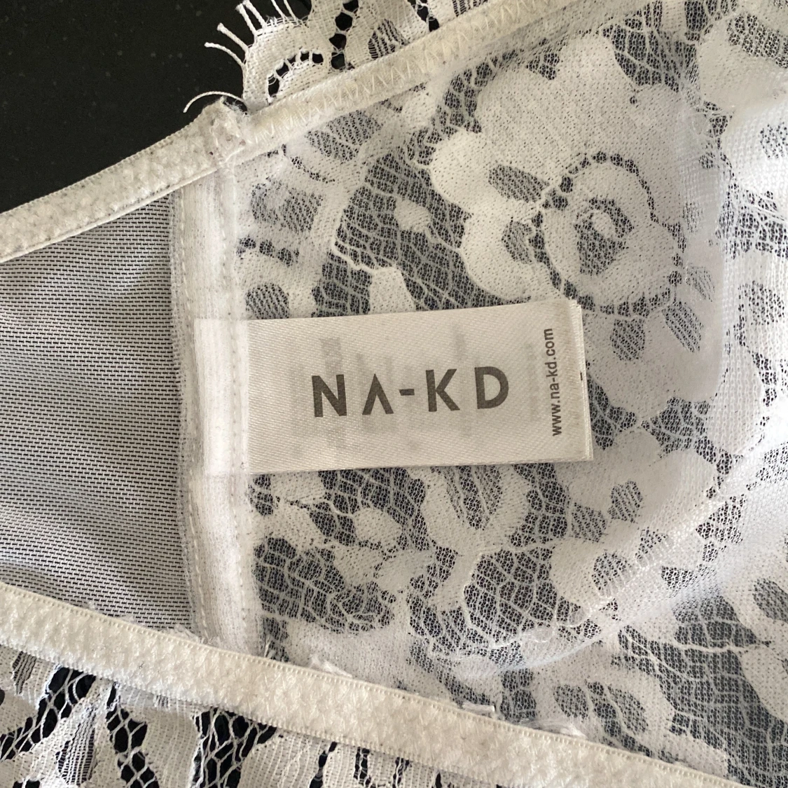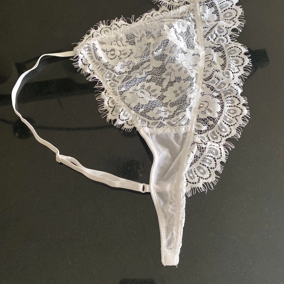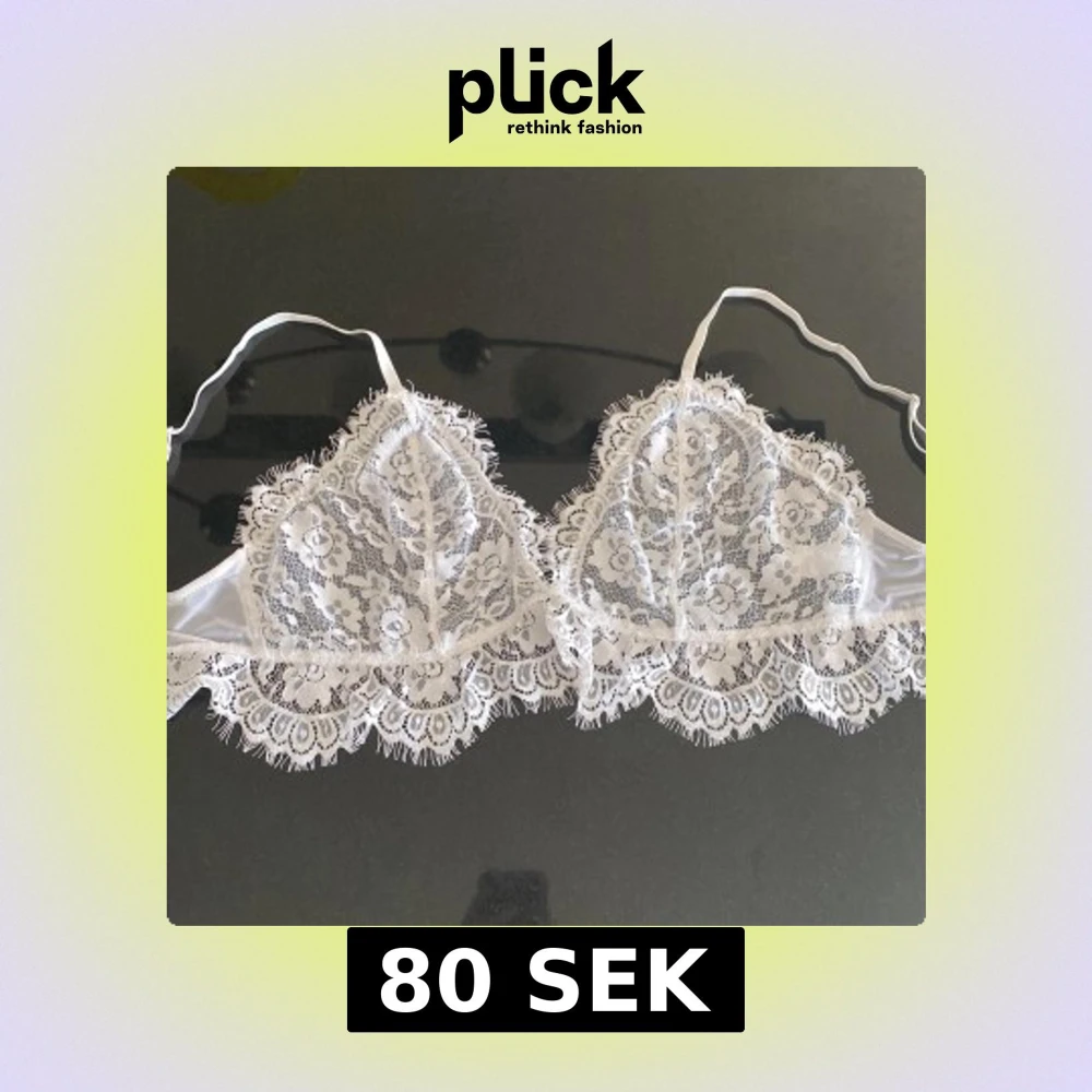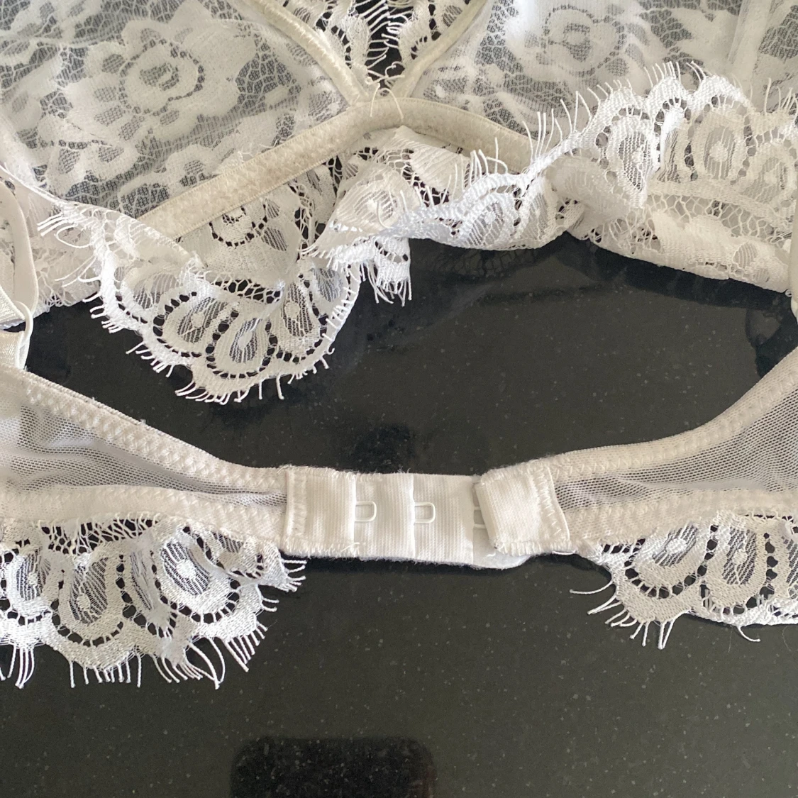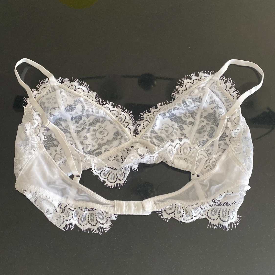 Superfin vit bralette i spets med blommigt mönster och volangkant runt hela. Axelbanden är smala och justerbara, och den har hakknäppning bak.