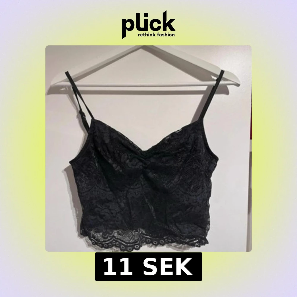 Svart topp i spets med tunna axelband och v-ringning. Är inte helt säker på vart toppen är ifrån