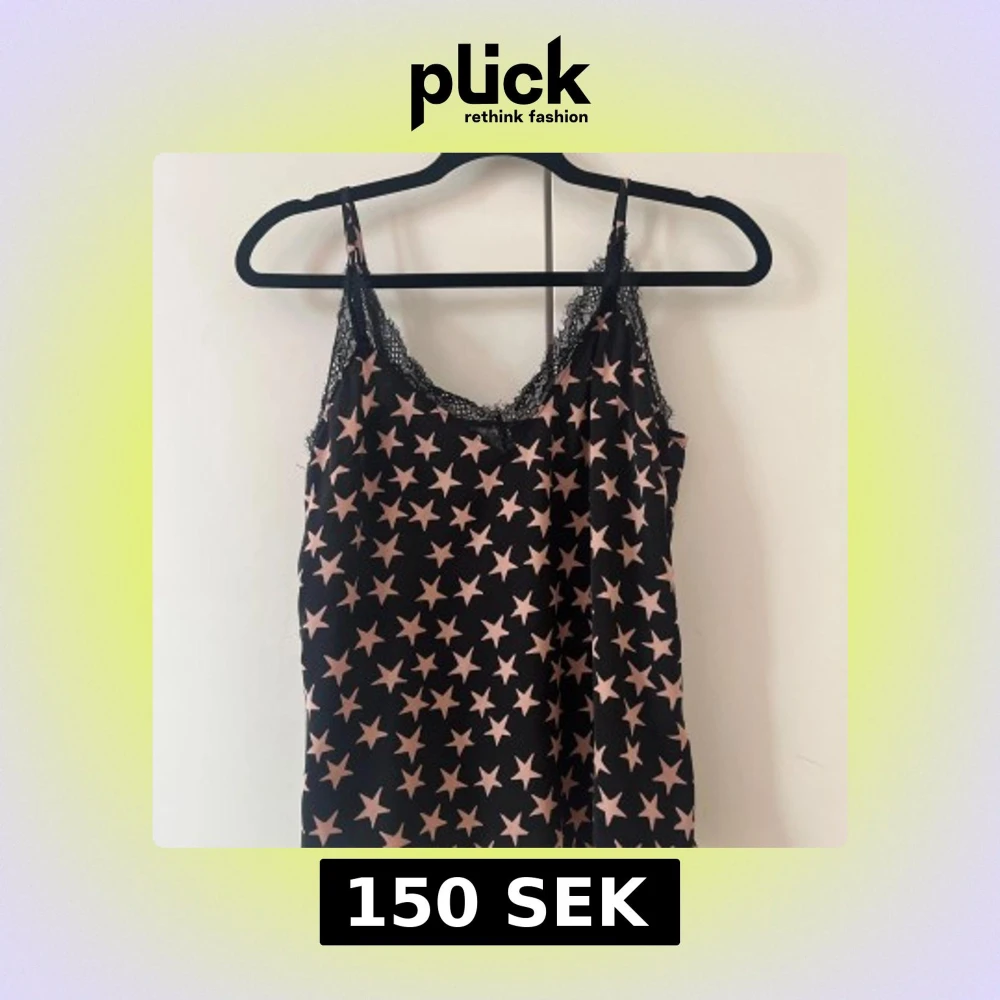 Supersnygg svart linnetopp med rosa stjärnor från H&M x Love Stories! Tunt tyg med spetsdetaljer vid urringningen och smala axelband. Snygg både som ett pyjamaslinne eller en gullig topp till ett par jeans🥰
