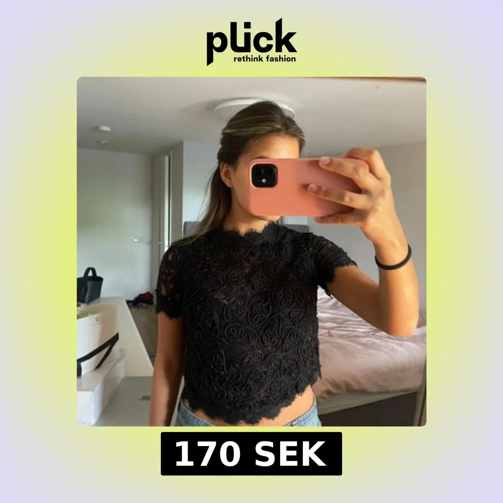 Svart spets blus från ZARA med korta ärmar och rund hals. Blusen har ett detaljerat spetsmönster och en synlig dragkedja i ryggen. Croppad modell med vågig kant nertill