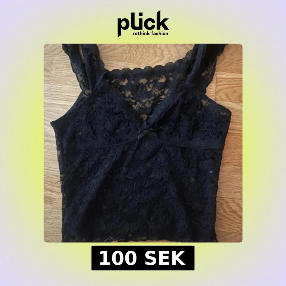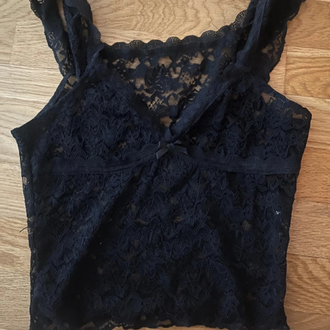 Supersöt svart linnetopp i spets med smala axelband och liten rosett framtill. Perfekt till fest