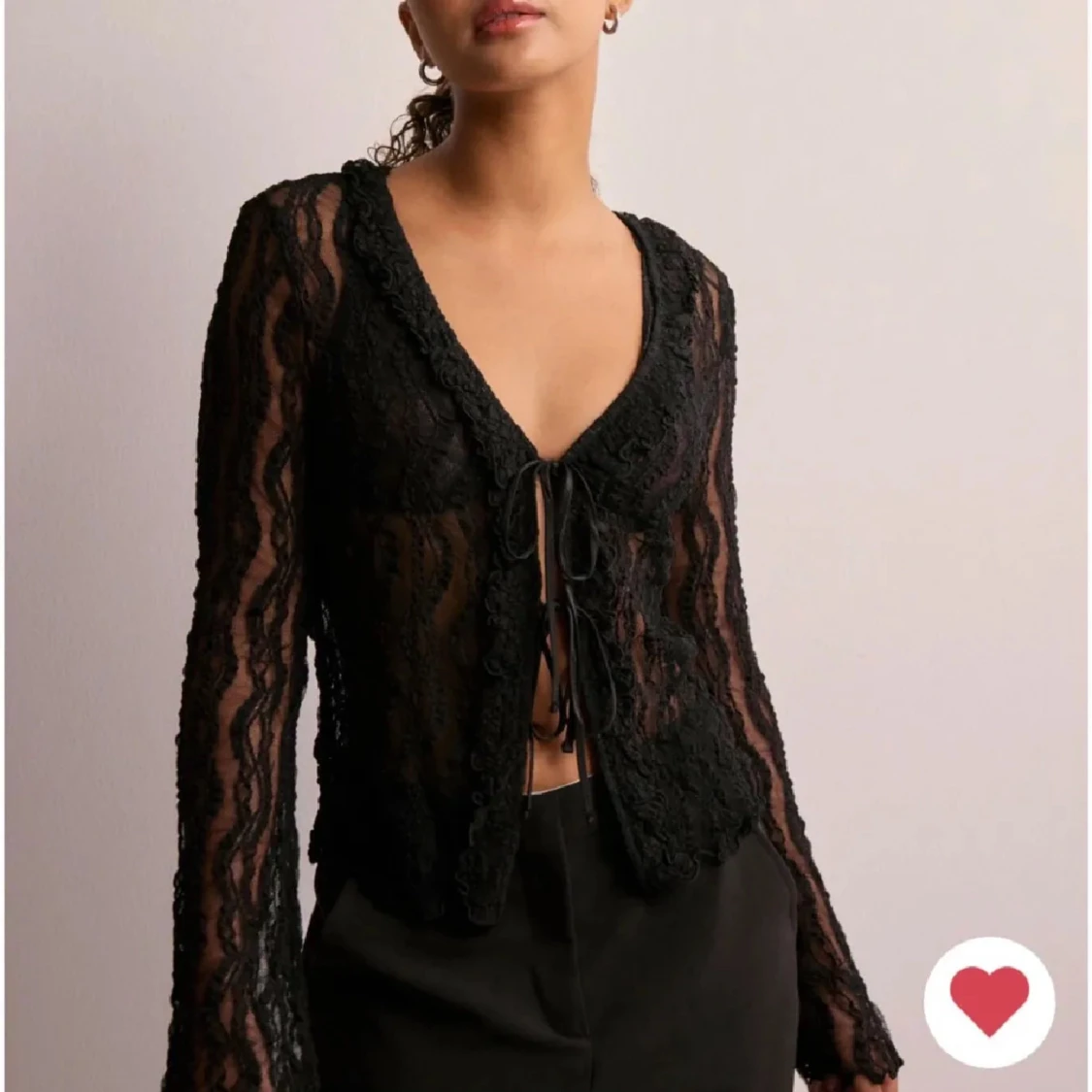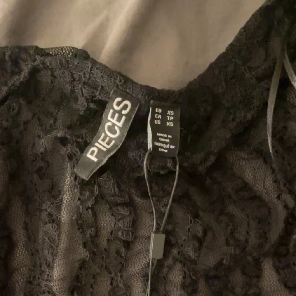 Säljer en svart transparent spetsblus från Pieces i storlek XS. Blusen har långärmade ärmar, v-ringad hals och snygg snörning framtill. Spetsen har ett vågigt mönster som ger en extra cool vibe. Perfekt för dig som gillar detaljer och vill sticka ut. Aldrig använd!