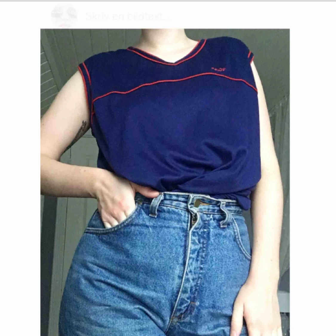 Ett mörkblått linne med breda axelband i storlek EU38.