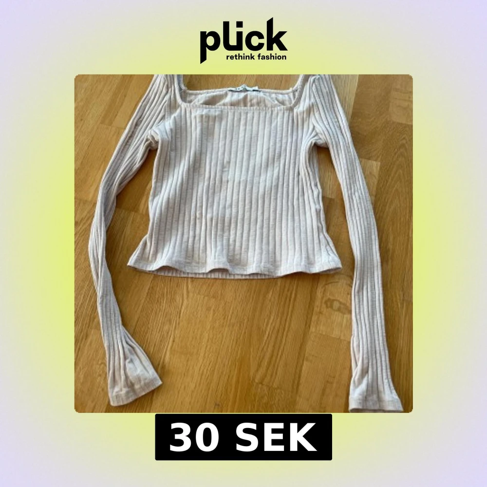 Säljer en beige långärmad topp med ribbad struktur och fyrkantig ringning. Toppen är figurnära och har en croppad passform, perfekt att styla till jeans eller kjol.
