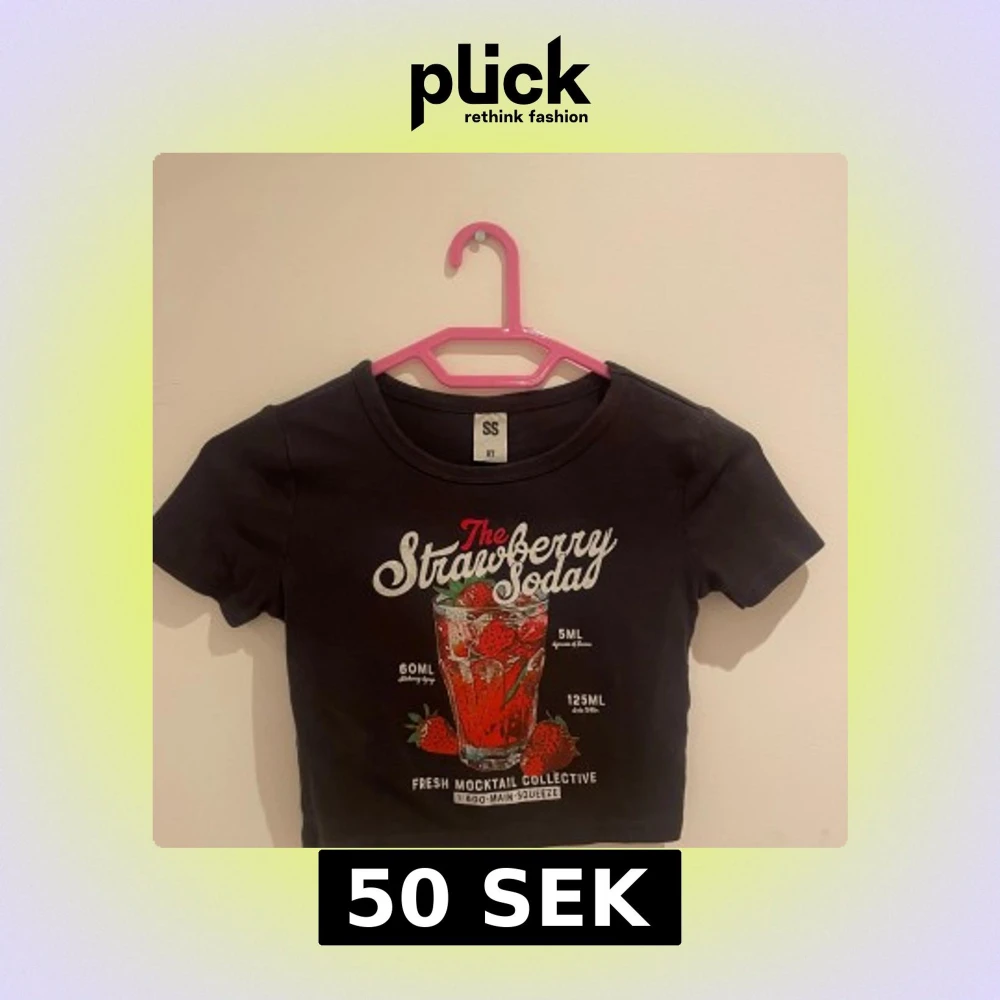 Svart croppad topp från RT med färgglatt tryck av ett glas jordgubbssoda och texten 'The Strawberry Soda'. Toppen har rund halsringning och korta ärmar. Perfekt för dig som gillar coola och lekfulla prints.