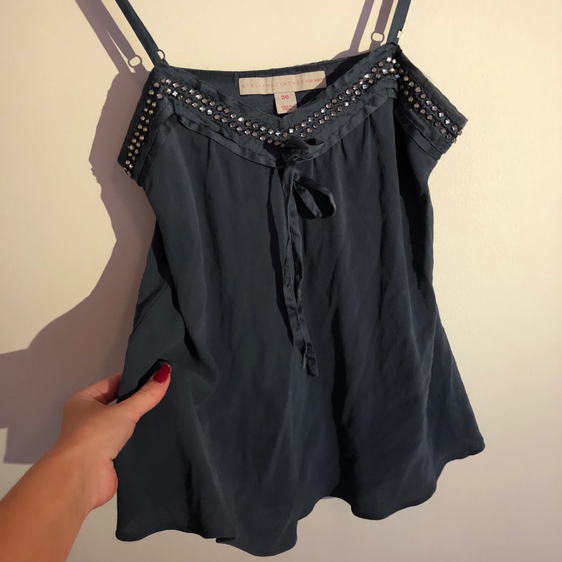 Snyggt linne från Stella McCartney kollektion med H&M! Stenarna går från ringningen i fram hela vägen runt även bak (se sista bilden). Snygg blå färg och har ett otroligt fall i tyget. Skriv gärna privat vid frågor!!💖💐 Budet ligger nu på 360kr!