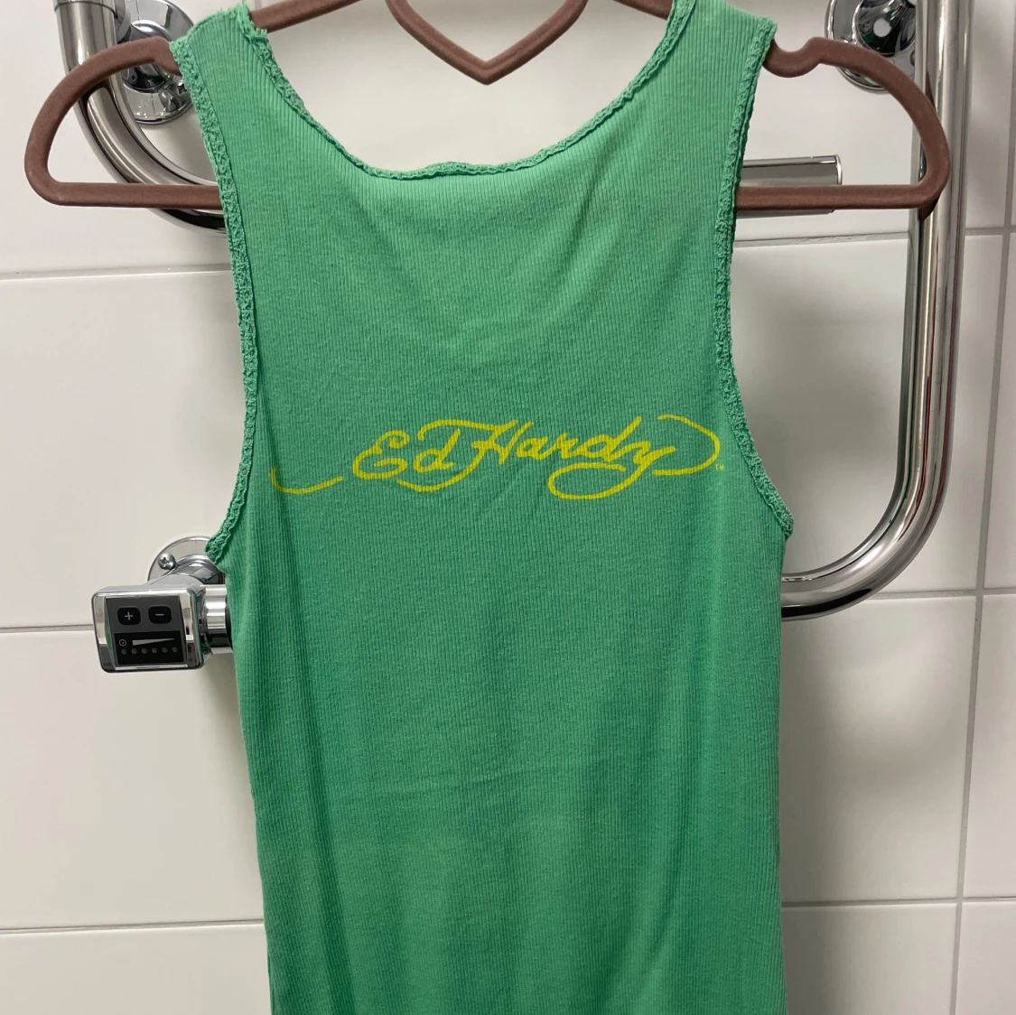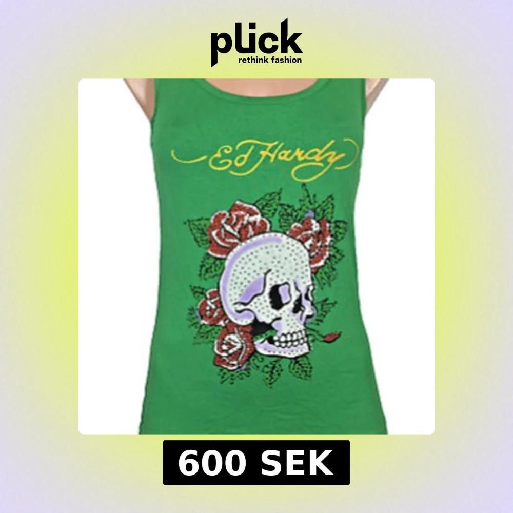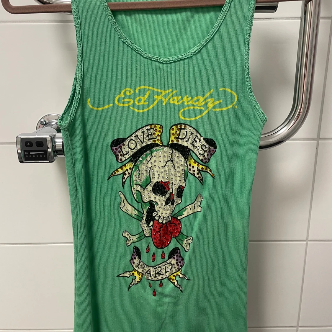 PRIS KAN DISKUTERAS VID SNABB AFFÄR! Går för ca 600-1500kr på andra sidor - Säljer en grön linnetopp från Ed Hardy med ikoniskt döskalletryck, röda rosor och texten 'Love Dies Hard'. Toppen har gul Ed Hardy-logga framtill och baktill, är ärmlös och ribbad i materialet. Vintage, säljs inte längre så är väldigt exklusiv. Stretchig så passar allt från S-L. Passar mig med S men även min vän som är en L