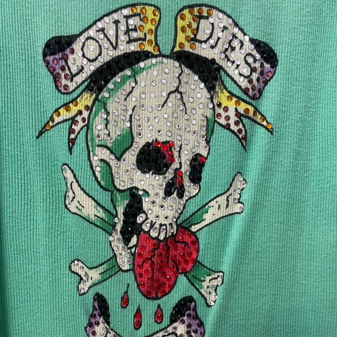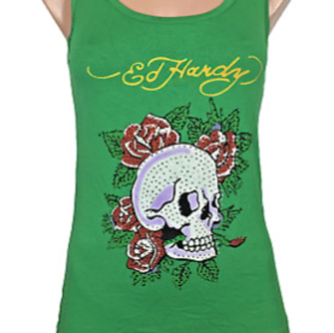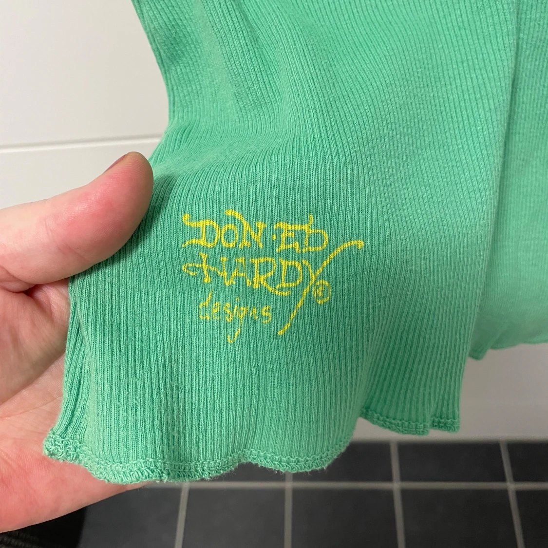 PRIS KAN DISKUTERAS VID SNABB AFFÄR! Går för ca 600-1500kr på andra sidor - Säljer en grön linnetopp från Ed Hardy med ikoniskt döskalletryck, röda rosor och texten 'Love Dies Hard'. Toppen har gul Ed Hardy-logga framtill och baktill, är ärmlös och ribbad i materialet. Vintage, säljs inte längre så är väldigt exklusiv. Stretchig så passar allt från S-L. Passar mig med S men även min vän som är en L