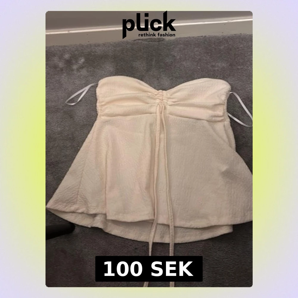 Säljer en krämvit bandeau topp med tunna axelband och snygg rynkning framtill. Toppen har en lätt utsvängd passform och långa knytband som ger en trendig look. Perfekt till sommarens outfits och enkel att styla med jeans eller kjol.