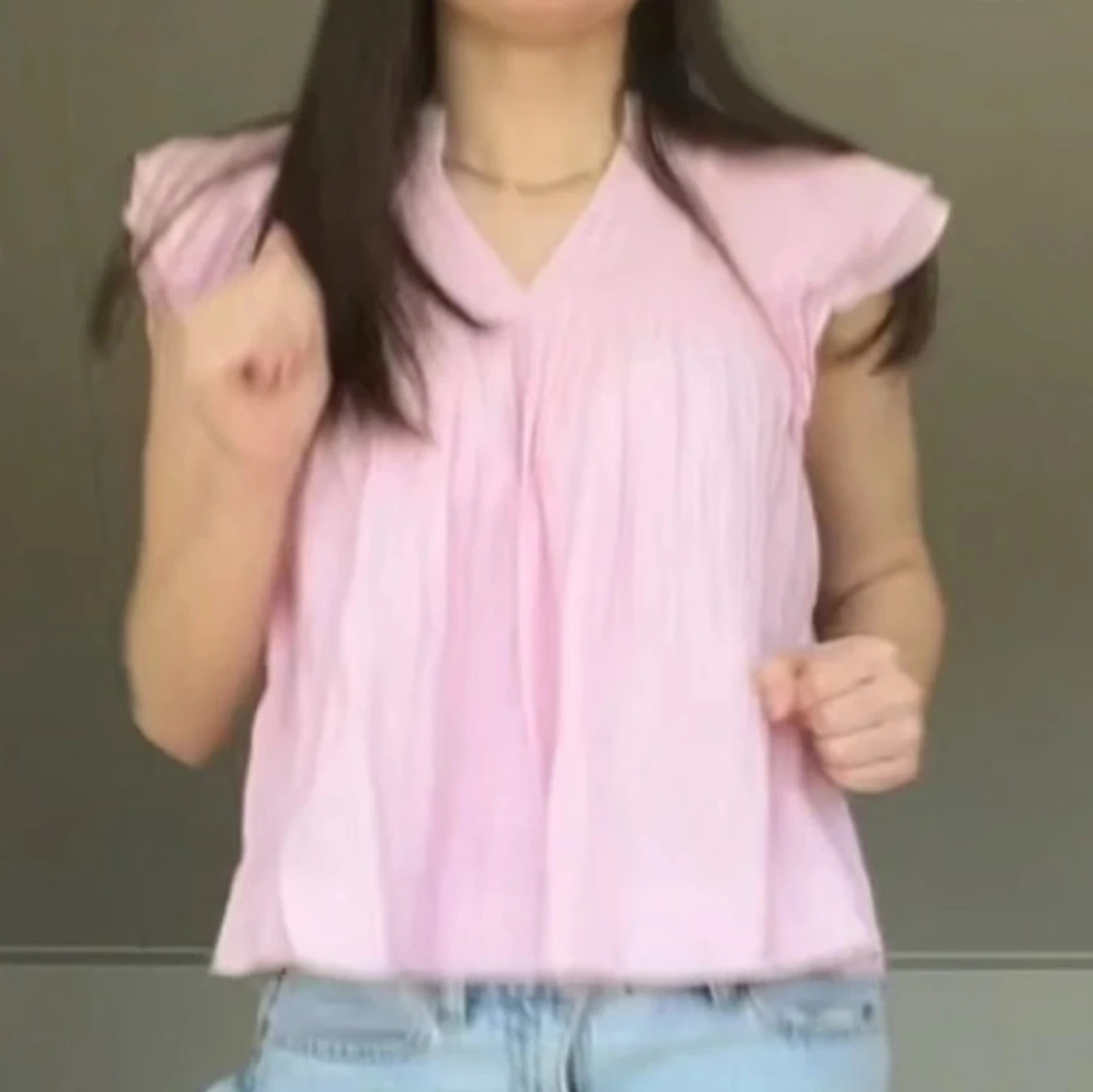 Söt ljusrosa blus med v-ringning och volangärmar. Blusen har en luftig passform och är tillverkad i ett lätt, skrynkligt bomullstyg som ger en avslappnad känsla. Perfekt för vår och sommar.